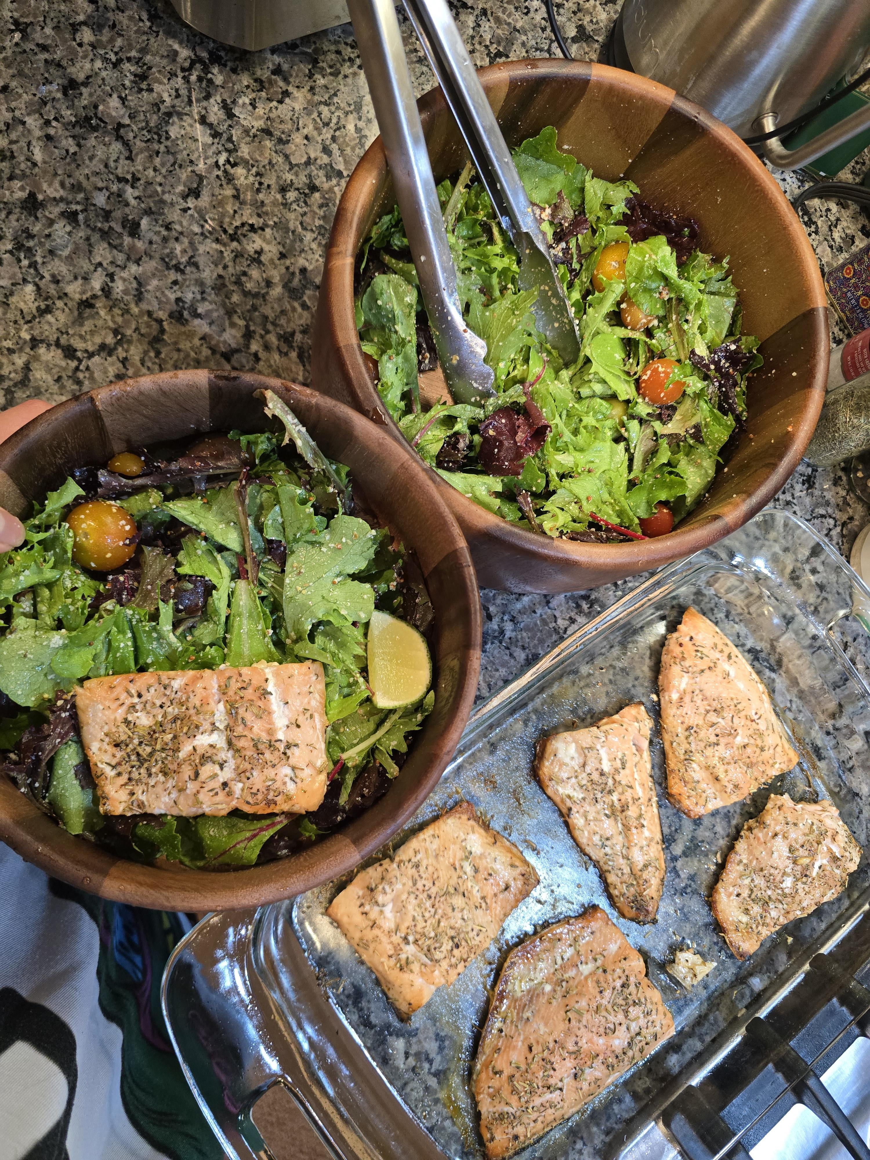 LilNyachtyy 7 months ago Recipe Salmon: Thyme Pepper SaltSalad: Cherry tomatoes Kale Lime Olive Oil Parmesan