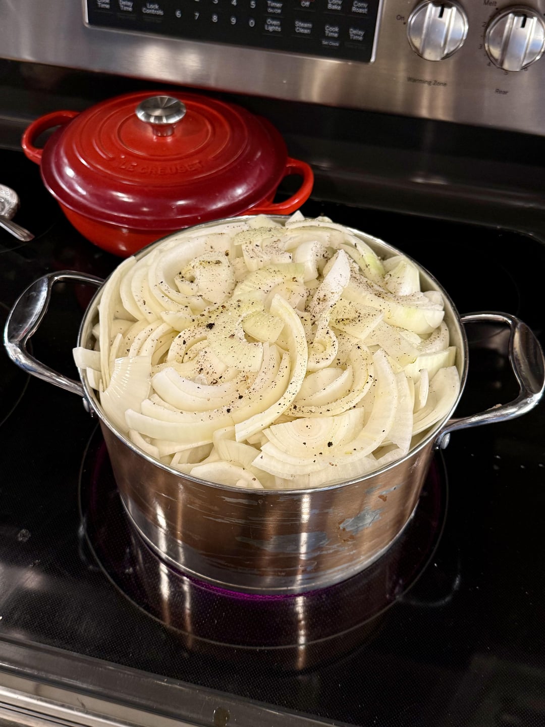 Are you trying to caramelize them? If so there is not enough room in that pot. Onions also need to cook alittle longer