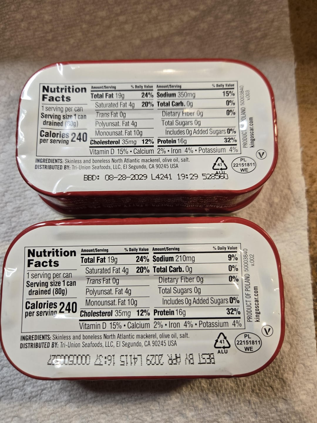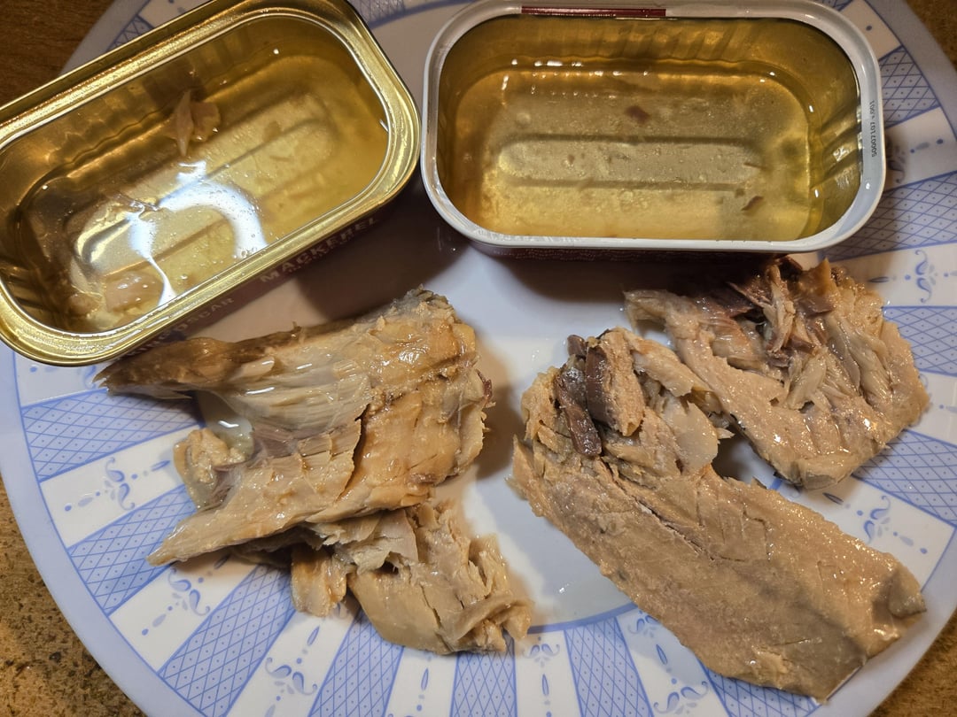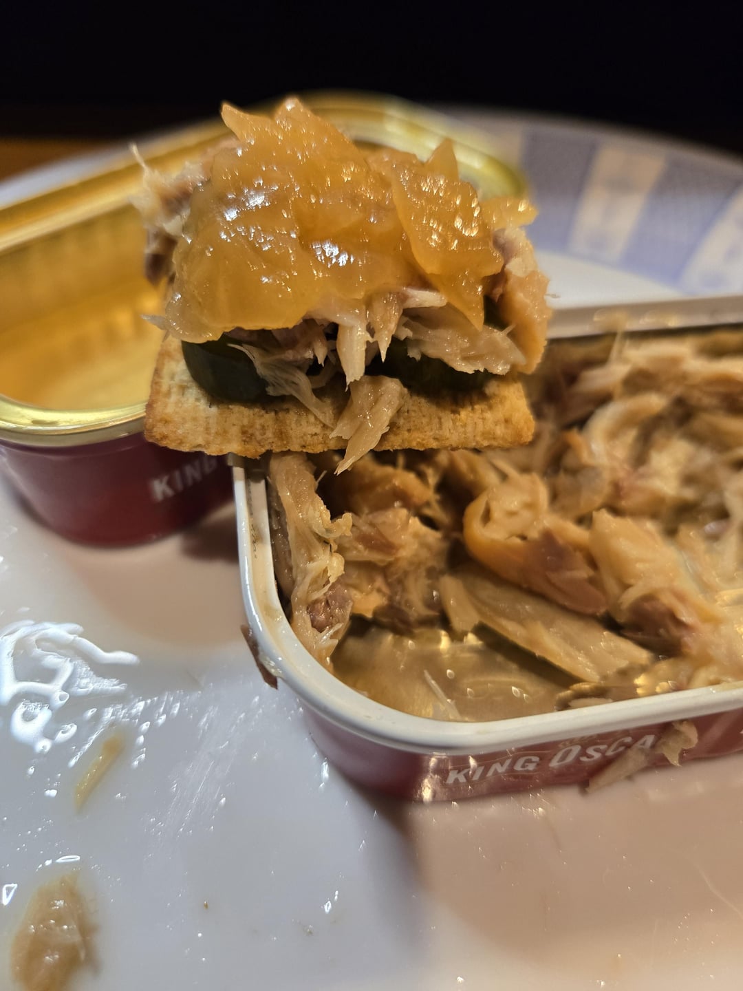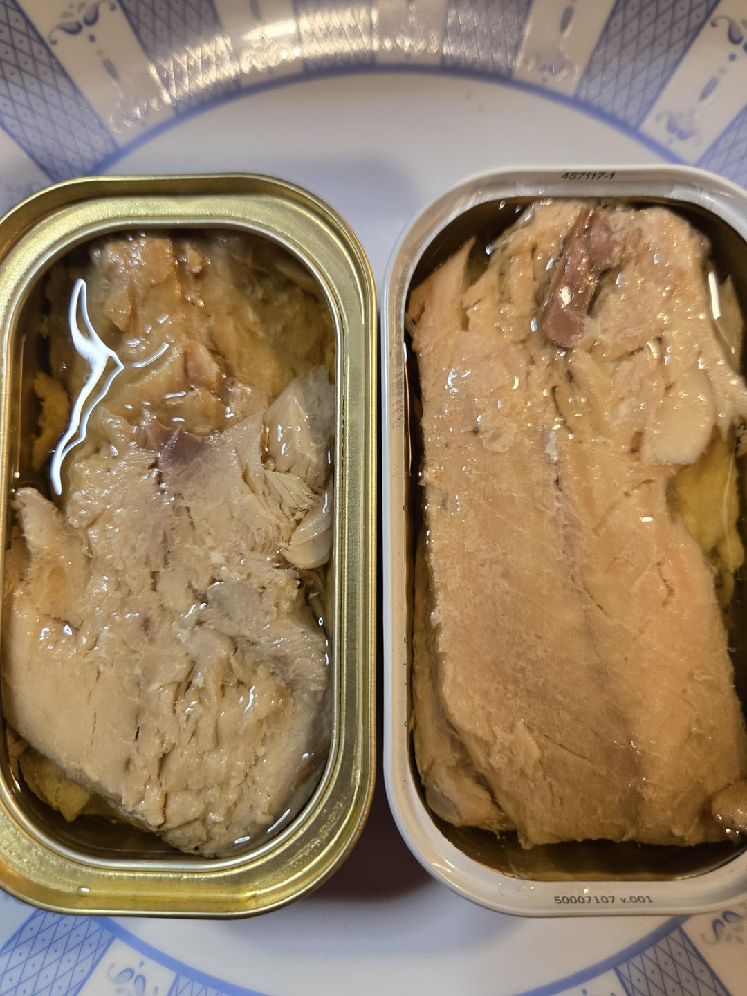 Side by side taste test. The only difference nutritionally is the sodium content, of which the pull tab has significantly more. Both had relatively similar cuts, a larger fillet and some scraps. I tasted the foil lid (left) first, then pallet cleansed with water before trying the pull tab (right). The pull tab seemed noticeably saltier due to the sodium level, but the meat seemed more tender, perhaps a bit fattier. The foil lid felt a bit firmer, but apart from the saltiness, they had very similar taste profiles. After the taste test, I served the remainder on roasted garlic triscuits with gherkin slices and caramelized onion jam.