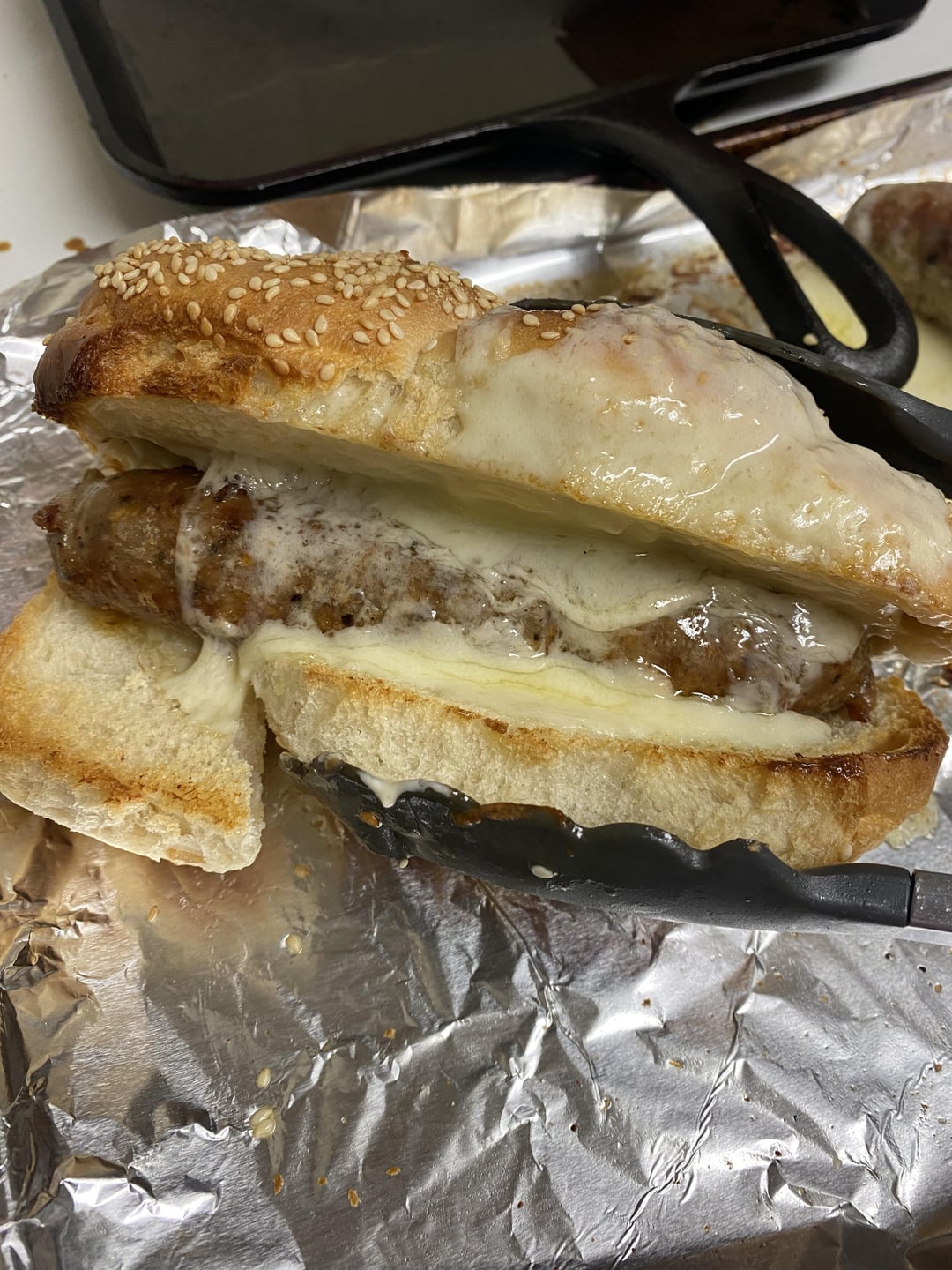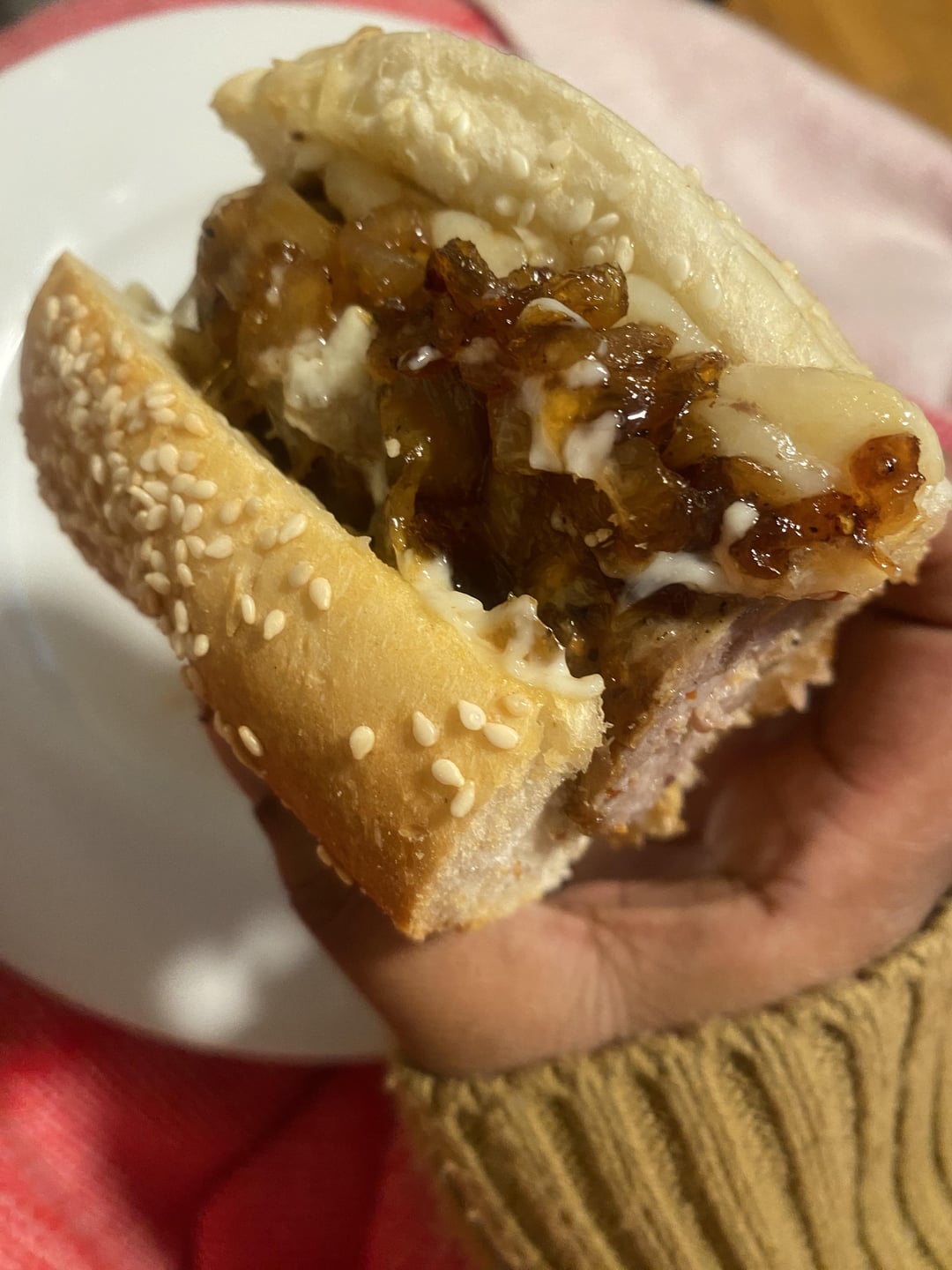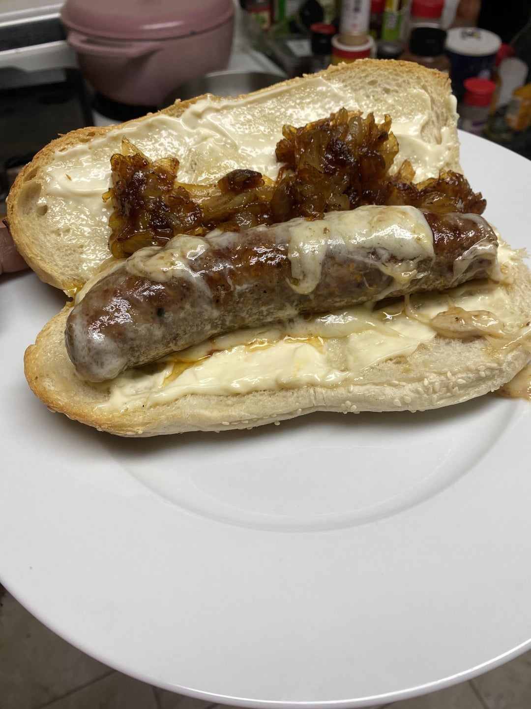 Then he picked up two braided sesame rolls from the bakery. He likes his plain so just cheese. I like toppings and sautéed some onions on the stove top and added mayo.