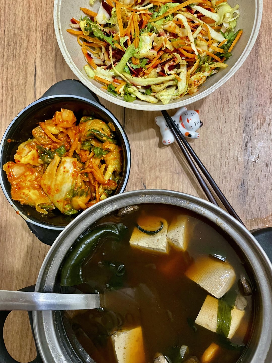 shredded veggies with sesame oil, japanese homemade kimchi, homemade miso soup that i prefer to make with aka miso