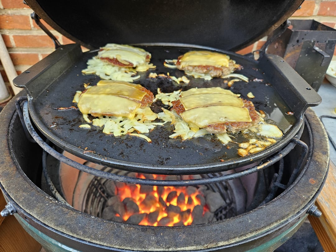 These may be my new favorite way to make burgers… Havent tried it on the egg yet. Looks amazing! What’s in the bottom right of the griddle in the first pic? Are those pieces of garlic? Centers of the onions?