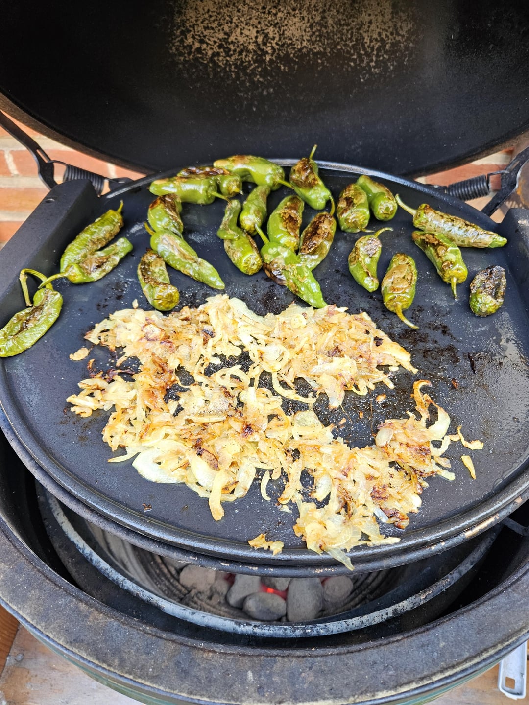 My attempt at oklahoma smashed cheeseburgers. Had pimento de padron grilled peppers as a starter for fun. So glad the sun is out again.