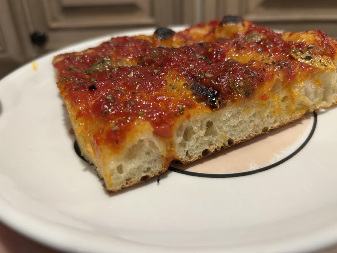Topped with milled whole peeled tomatoes (Stanislaus), shaved garlic, anchovy, evoo, Malden salt, peperoncini, evoo and dry oregano.