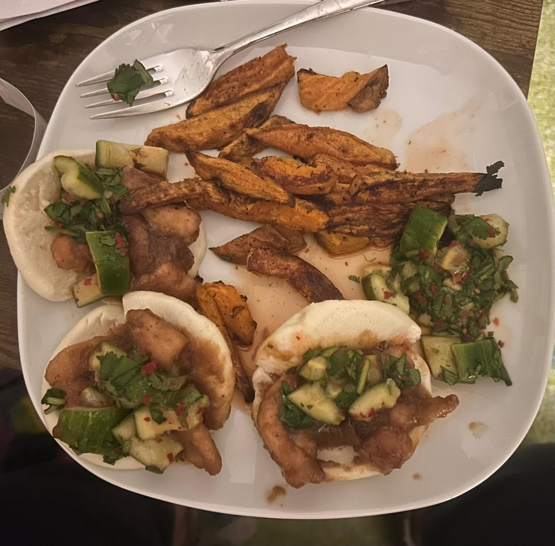 The combination of fresh coriander and cucumber with the sweet, slightly spicy and umami rich sauce really sets of the chicken and the soft fluffy Bao buns.