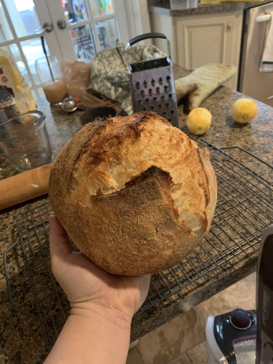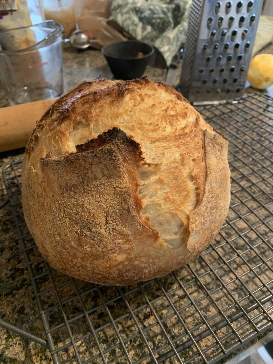 Mix starter and water till bubbly, add flour and salt. Combine with my fingers, cover with plastic wrap and let set for an hour. Did three or four sets of stretch and folds whenever i remembered. Think the first one was after an hour, then the other three were legit like maybe two hours after the fact Lolol. Then I let it BF on my counter (72ish degrees Fahrenheit). It was almost ready at like 9:30pm but then I fell asleep… woke up at 1am, did the sloppiest shaping of my life and threw it in a banneton. Cold proof till about 10am. Preheated oven at 500, baked for 30mins at 500(my oven is old AF), then took the lid off and baked for 20ish mins till I liked the color. Then I baked it slightly longer cause the last loaf I made was undercooked hahah. I also rotated my Dutch oven around a bit because once again, my oven is old AF and cooks unevenly. Let her cool for two ish hours and devoured it.