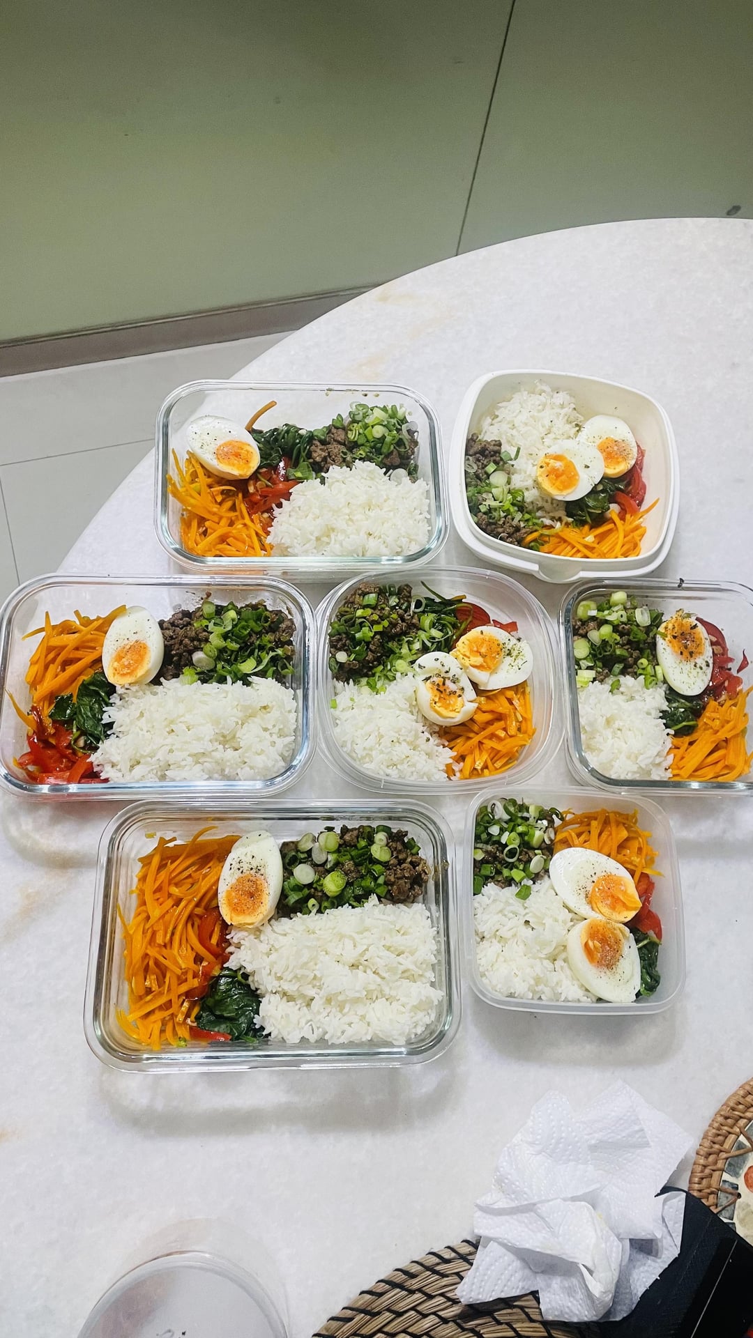 Rice bowl: sauteed the carrot and red pepper with garlic separately, i added some broth that i made from leftover chicken bones and veg scraps. For the beef, brown minced beef then add the sauce, I added the broth again coz i have it handy, bt not necessary. I blanched the spinach with boiling water, squeezed out the water then add sesame oil, salt and minced garlic. Boiled eggs: put eggs in rolling boil wafer for 7 mins, ice!
