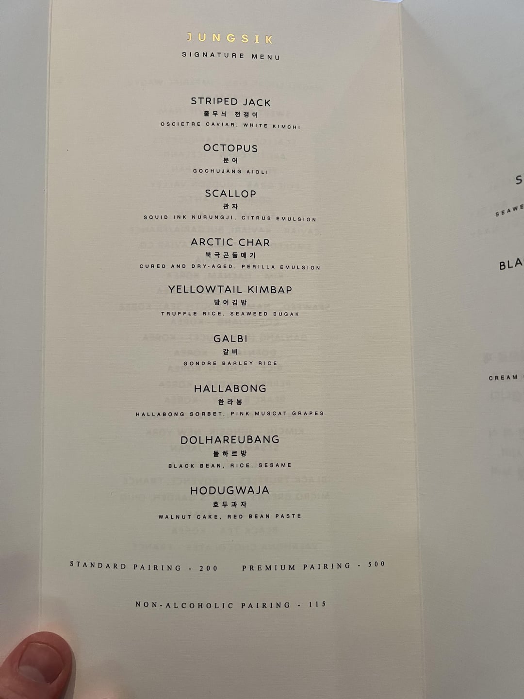 Went to Jungsik for the first time, knowing relatively little about Korean cuisine. I liked it! I’m not sure it really contained as many new flavors as I was expecting, so I’m wondering if this is an Americanized version of Korean food. (I notice that a lot of people use the term “funk” to describe a taste quality in Korean food and I’m not really sure I felt much funk here.) I’d describe the tastes as elegant, sometimes subtle, but multilayered. A couple times, I initially found myself disappointed with a dish only to realize that it contained a lot of nuanced flavors that i liked the more I ate.