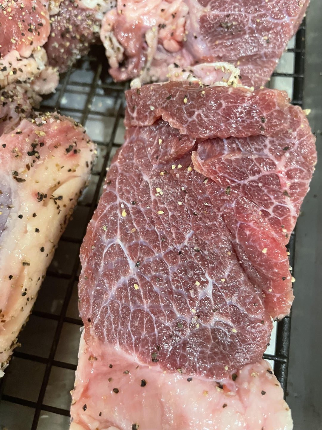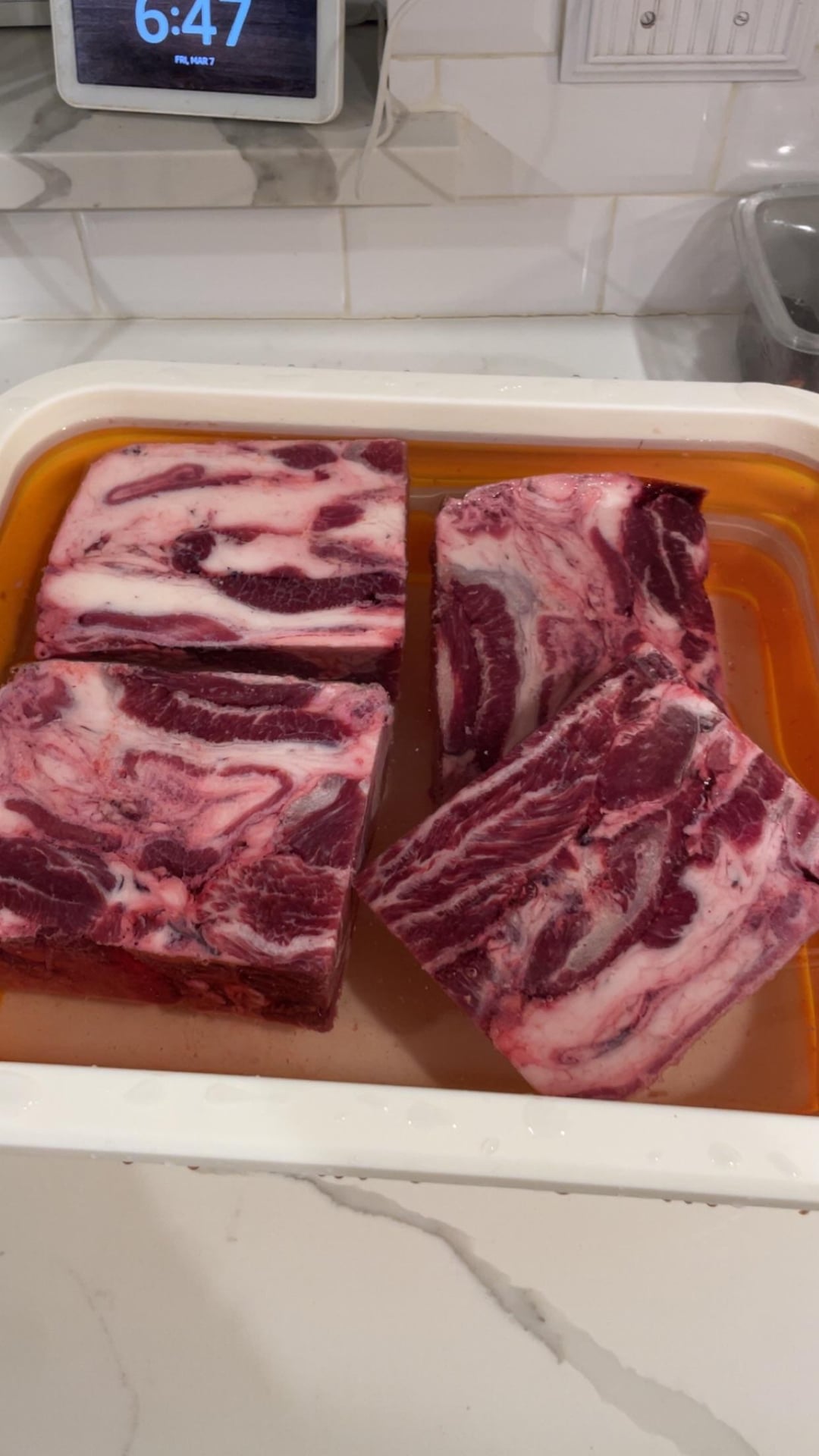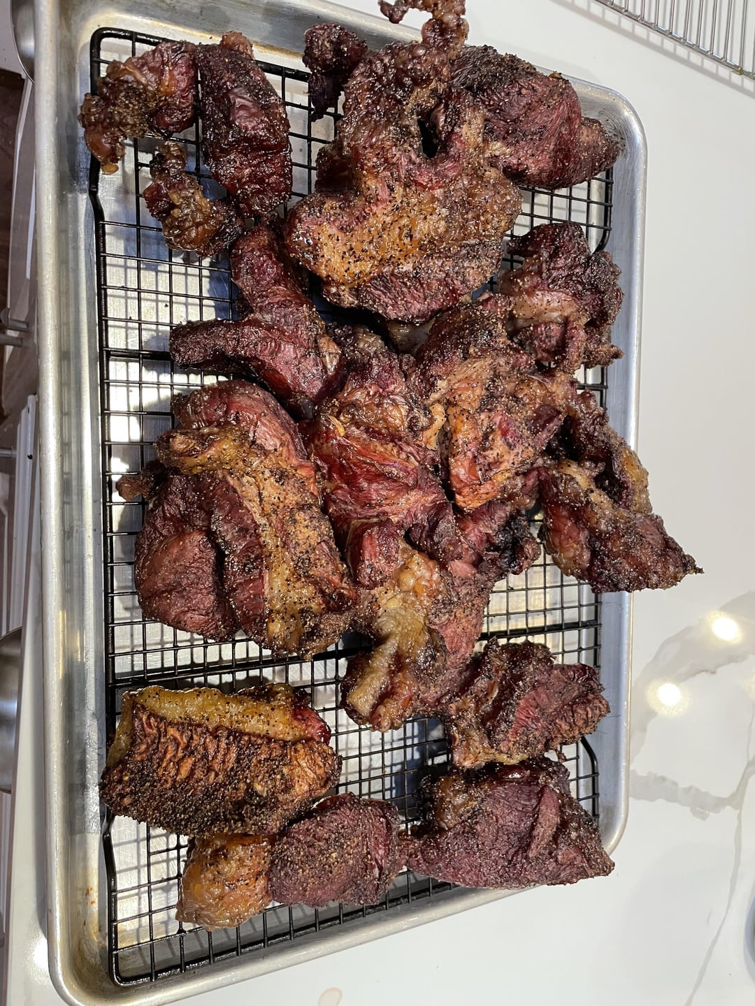 Beef cheeks were purchased from a local Mexican market and frozen into these blocks. Defrosted, patted dry, and then SPG and into the fridge on a rack overnight. In the morning, I got them on the members mark 36 for 3 hours with post oak and mesquite chunks at 250. Pulled the meat off the smoker and then threw it in a crockpot on low until dinner (8 hours or so).
