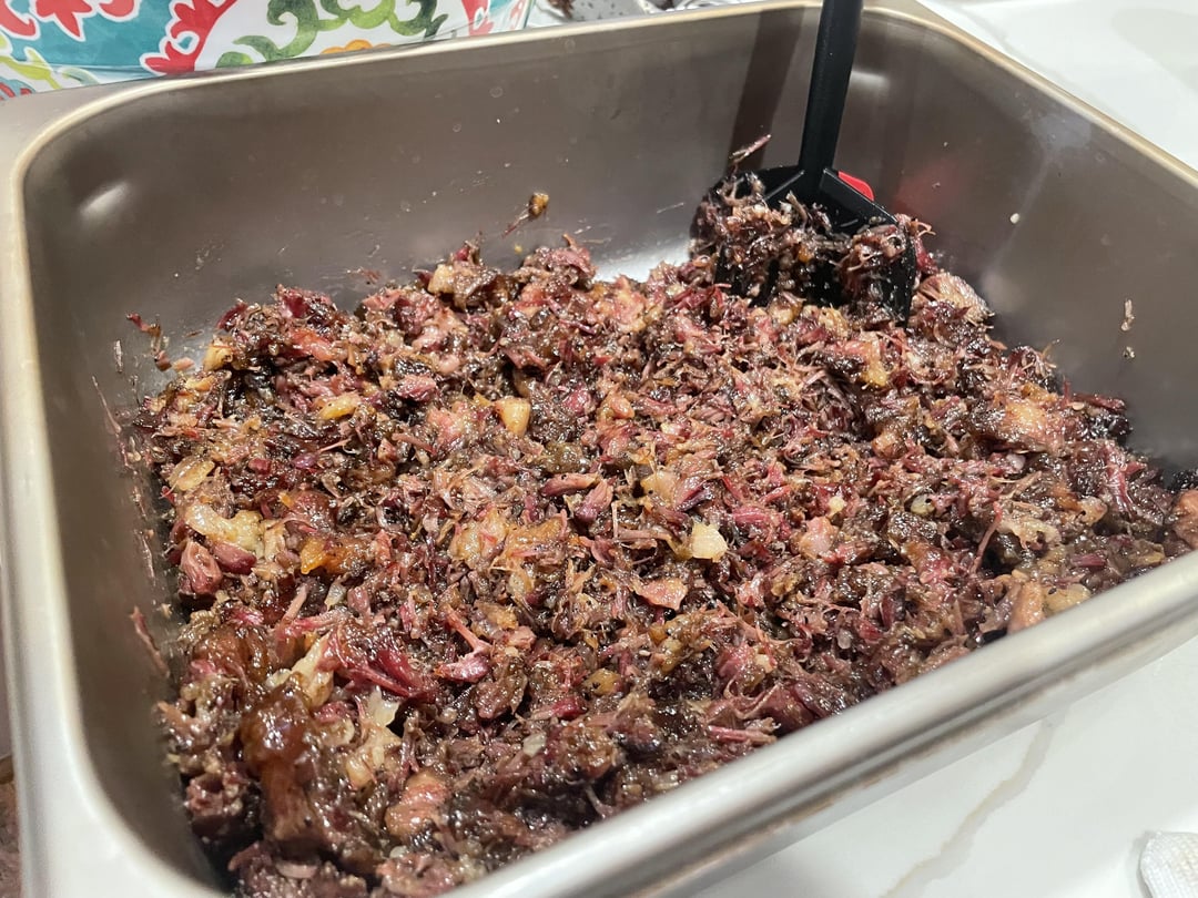 Shortly before dinner I used a colander to help separate the meat from all of the rendered fat and used my ground meat smasher/chopper to help shred before throwing it into some tacos. Fat was filtered and will be saved for tallow. Came out absolutely fantastic!