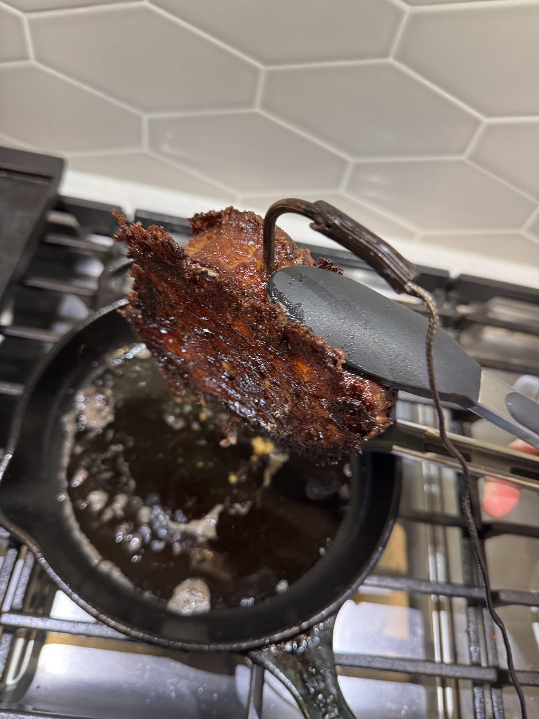 Cooked in cast iron with a little vegetable oil. Fu heat (500), 9' each side with butter slats on top half way through. Cheese caramelized and liquifed between the caramelized outers, making it a nice beefy cheddar.