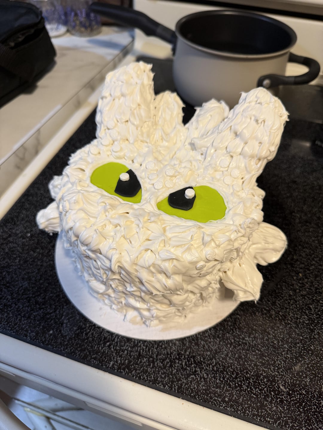 First time ever decorating a cake and it was for a test run for my daughter’s How to Train Your Dragon party next weekend. Didn’t want to waste black food color, so I used plain white for my first go at Toothless.