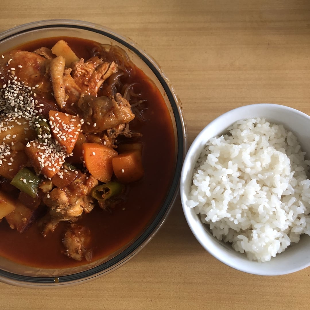 1. **Prep:** Soak glass noodles, clean chicken, and soak in milk for 30 min. 2. **Make Sauce:** Mix soy sauce, gochujang, gochugaru, cooking syrup, minced onion, cooking wine, and fish sauce. 3. **Cook Chicken:** Place chicken in a pot, add sauce and broth (or water), then boil. 4. **Add Vegetables:** After 15 min, add potatoes and simmer for 30 min. Then, add remaining vegetables. 5. **Finish:** Add soaked or boiled glass noodles, simmer for 5–10 min, and serve.
