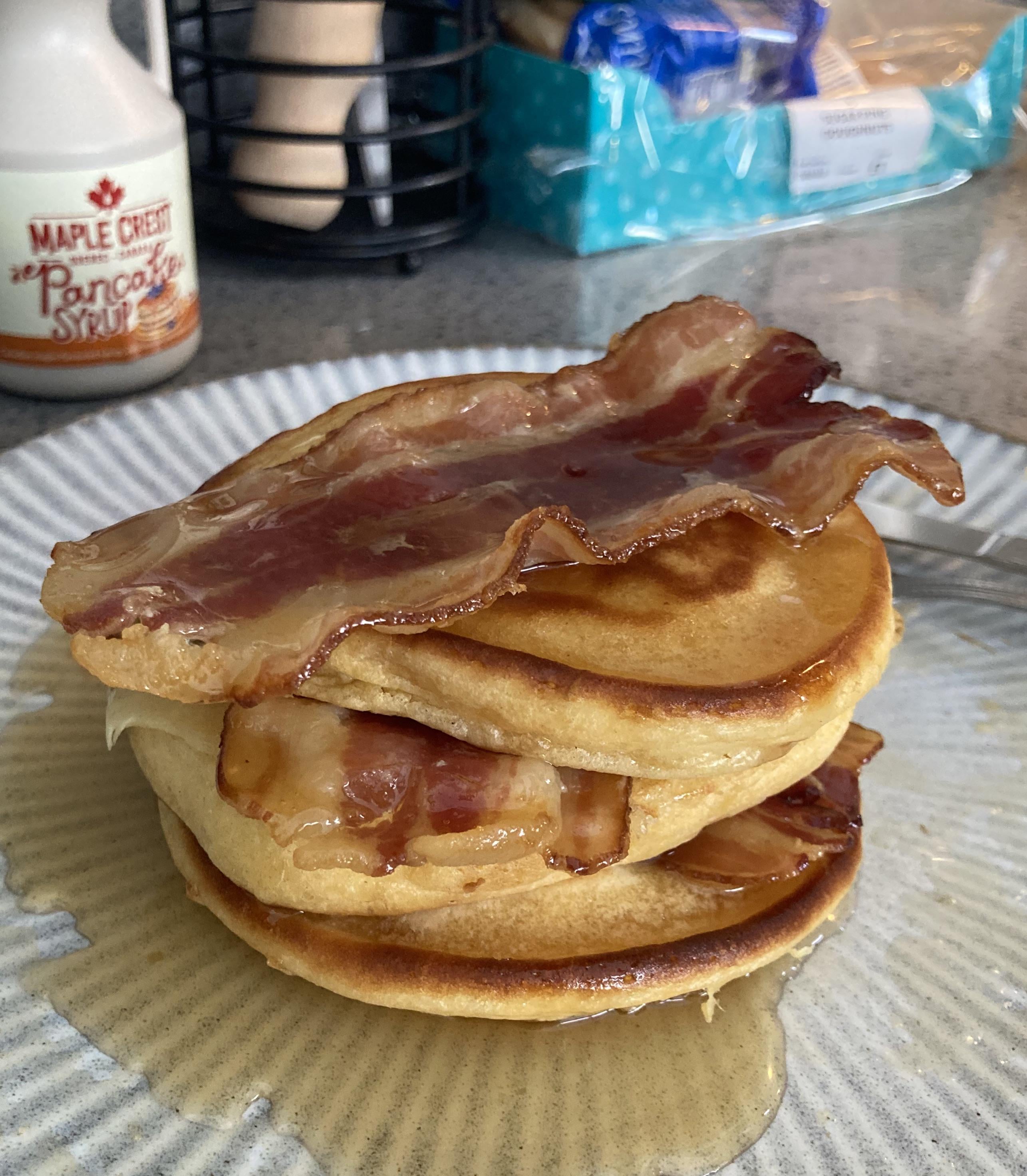 Homemade pancakes w crispy smoked bacon, made for me by my boyfriend
