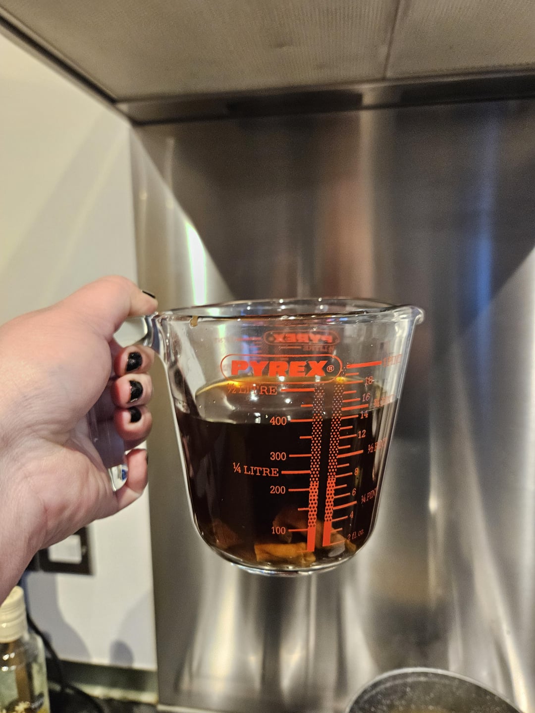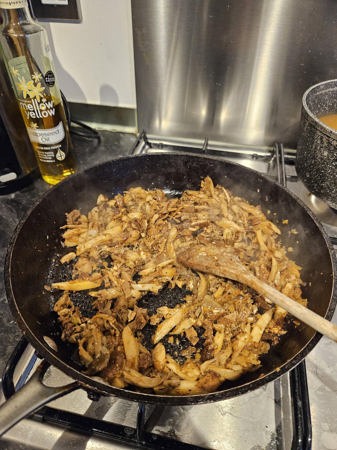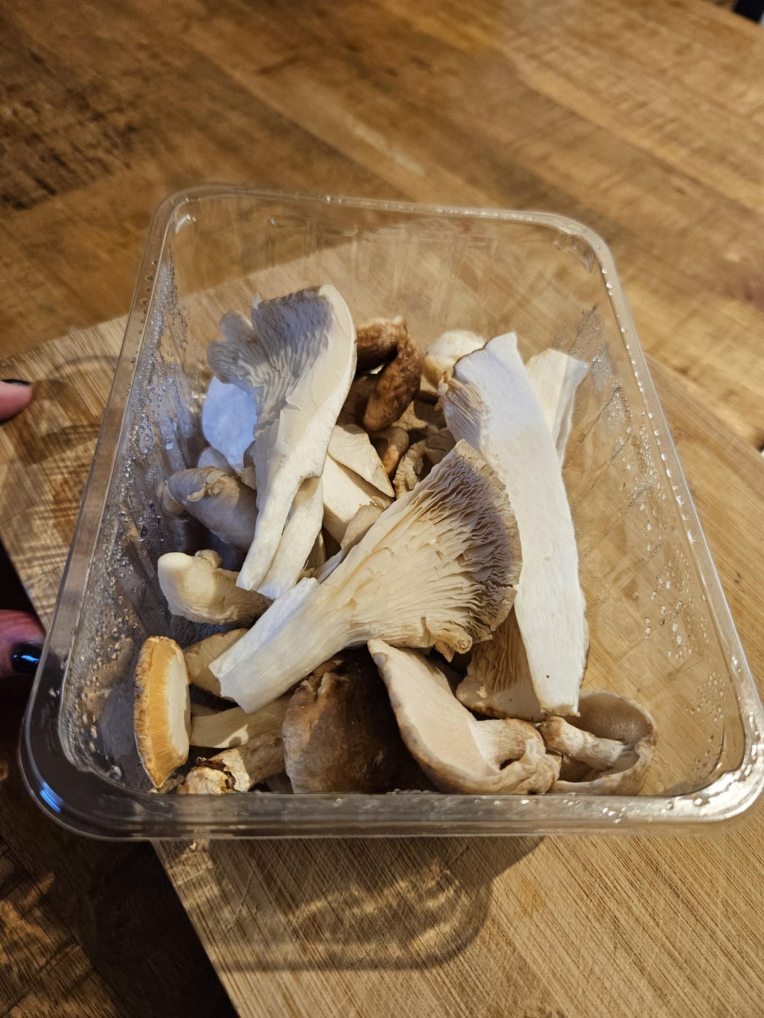 Shallots, fresh musrooms, soaked dried mushrooms 🍄 – garlic, oregano, thyme.