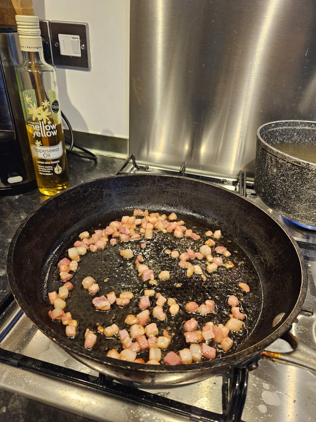 This is super easy to keep veggi but found these pancetta lardons in the freezer, so in they went!
