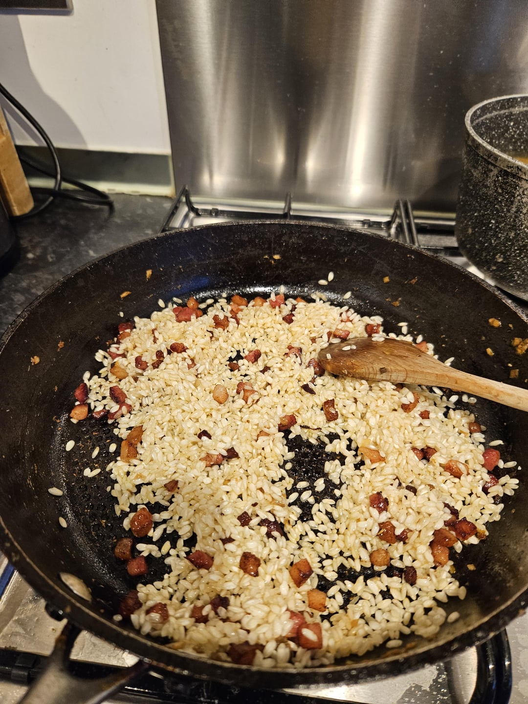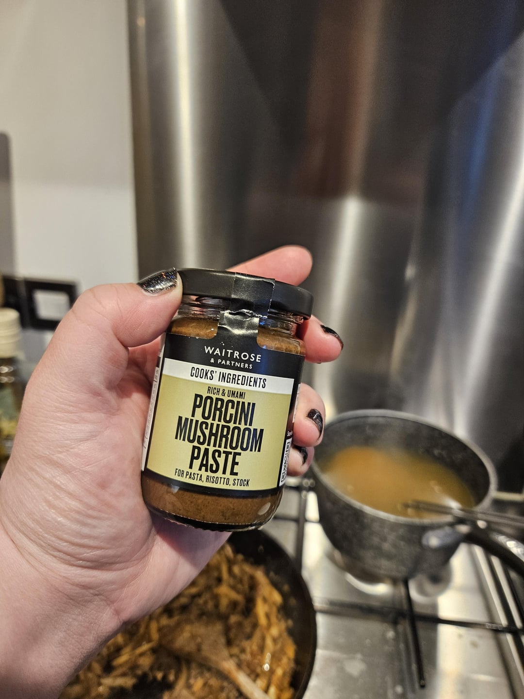 Finished! I used hot chicken stock, the mushroom stock, a spoon of marmite. When finished, stirred in some chunks of cold butter, checked seasoning and then parmesan.