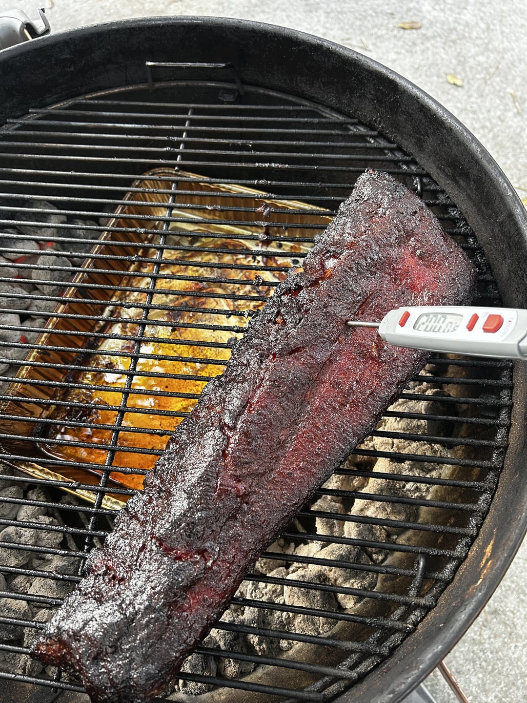 First time cooking ribs on the grill and first time using the snake method in the Webber Kettle. A little over 5 hours and these baby back ribs came out better than expected. Slathrred with mustard for the rub to stick to. After 2 hours on grill wrapped in foil with butter and Hickory/brown sugar bbq sauce, grilled for 1.5 hours wrapped. Unwrapped and grilled for little less than hour basting halfway through with sauce from foil packet. Really happy with the results.