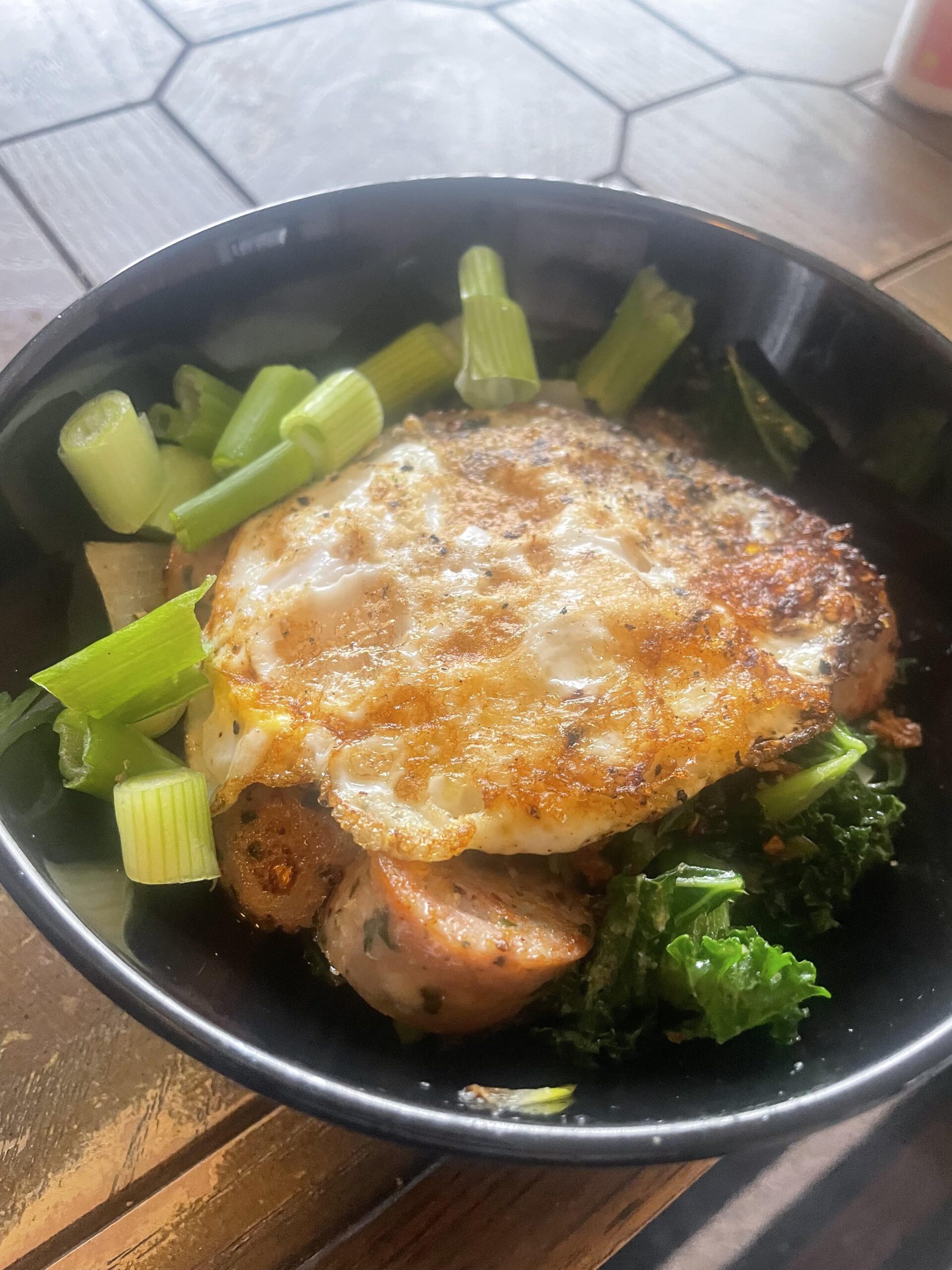 Sautéed kale, chicken sausage, onion, chili oil & fried shallots. Fried egg on top 🫡 by SaffronSpecs Write A CommentYou must be logged in to post a comment.