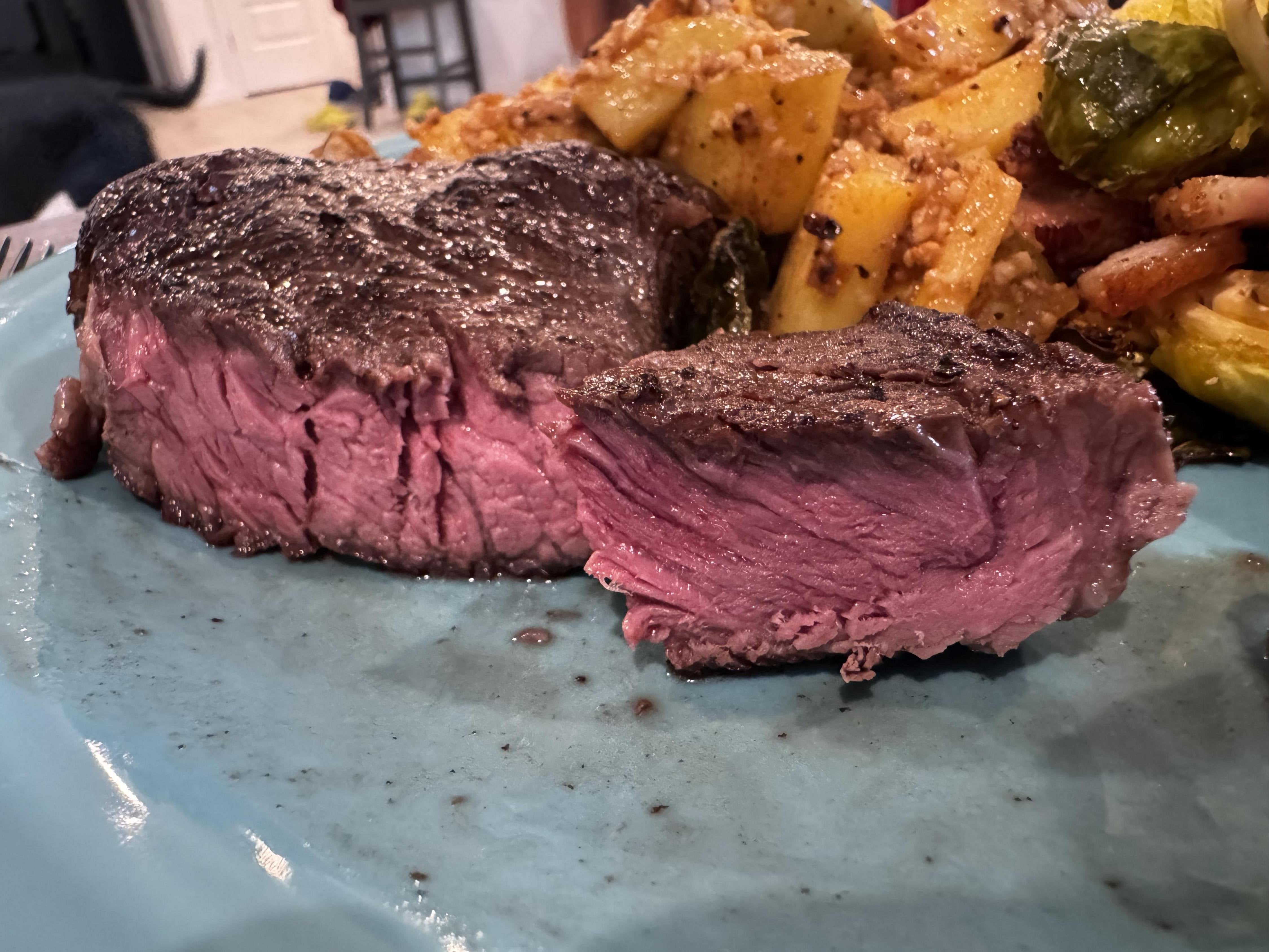 133 for 2 hours, salt, pepper, butter, garlic, and then about a minute on each side to finish. Sides are Brussels sprouts and potatoes