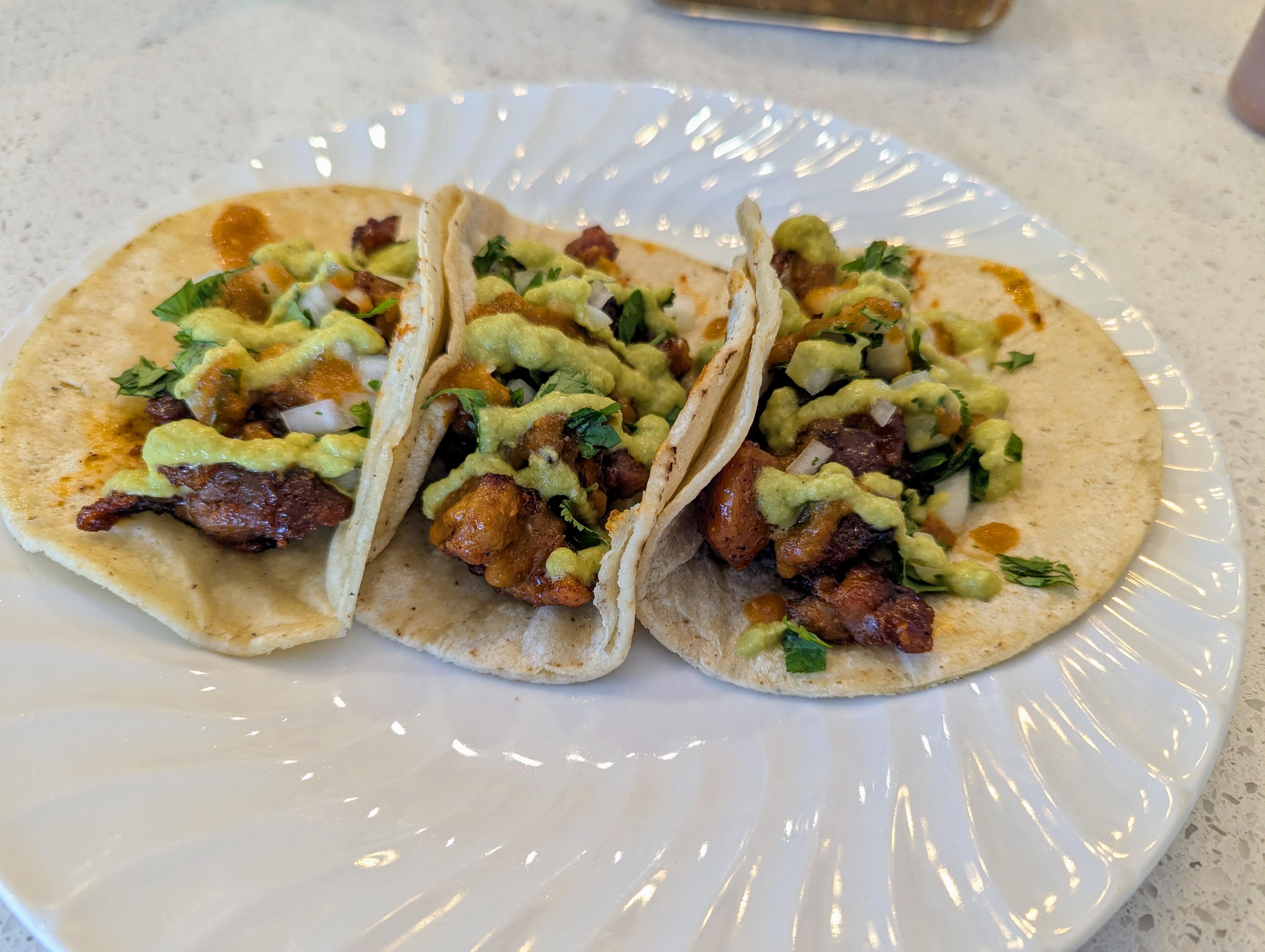 Diced chicken thighs. Tossed with salt, pepper, Cajun seasoning. Cooked in a large pan in some avocado oil until very well browned. Dumped in some BBQ sauce (I asked ChatGPT to give me a copycat recipe for Chipotle's brisket BBQ sauce) and cooked until reduced and starting to caramelize. Served with some onion & cilantro, a tomato & arbol salsa, and a creamy jalapeno salsa.