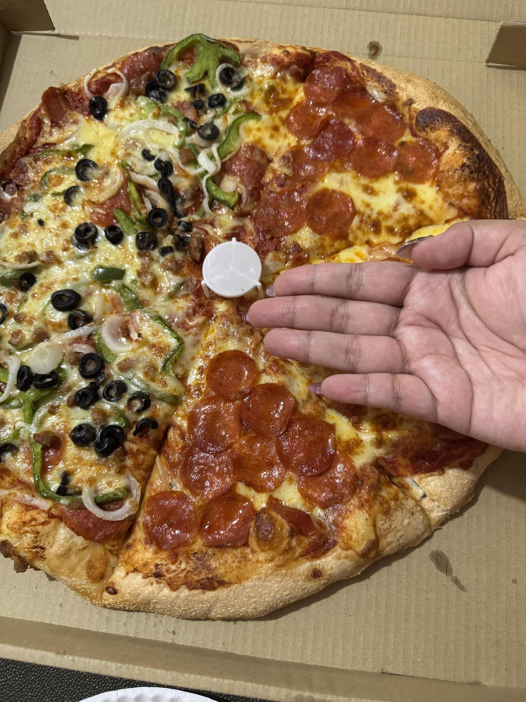 this is an 18” pizza from S&R, the Filipino version of Costco. hand comparison in 2nd photo for reference. i was initially thinking of having 2 slices but now i’m not so sure. 🙁by ResponsibilityOver72 2 Comments Own-Blackberry-1857 11 months ago maybe 450-500 to be safe? G_8_9 11 months ago 250-300Write A CommentYou must be logged in to post a comment.