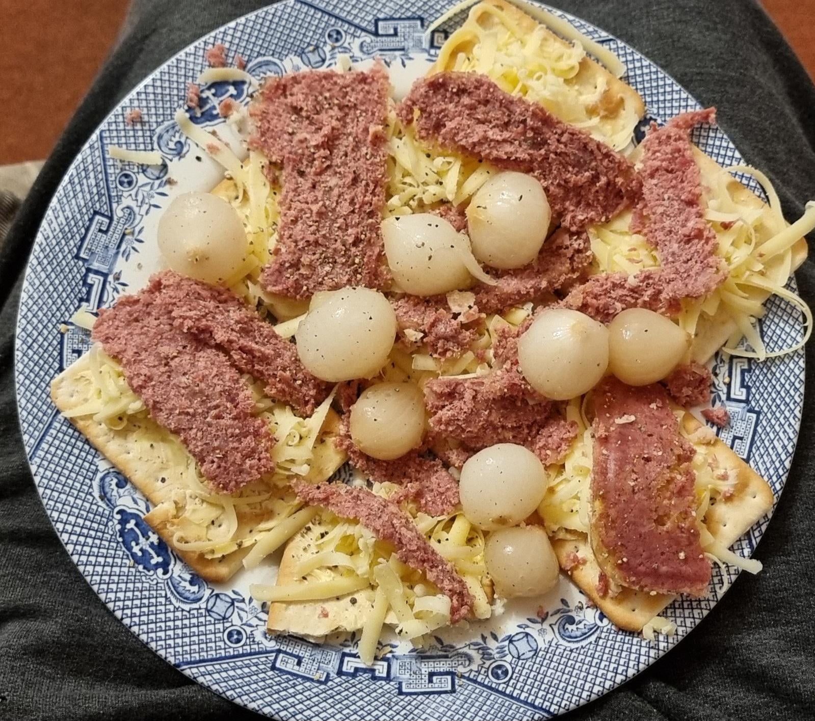Crackers, corned beef, cheese and onion.