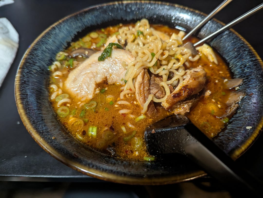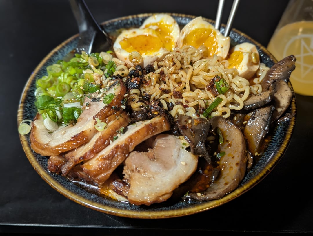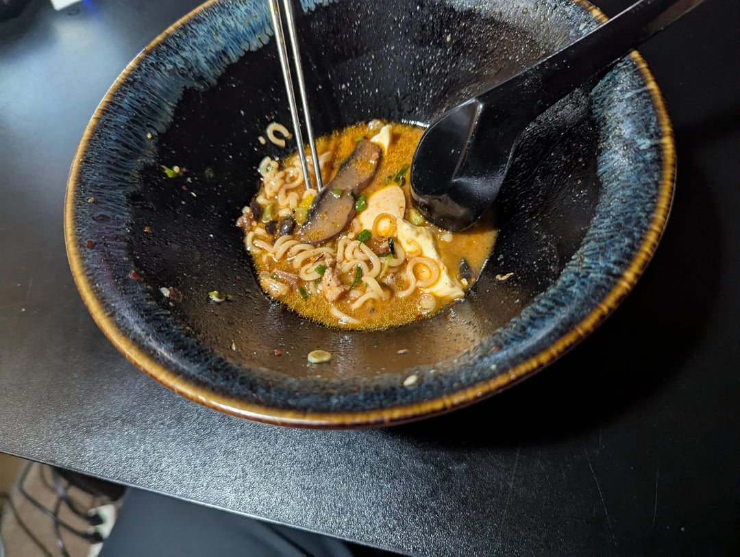 Spicy miso tare, leftover chicken broth, last of my chashu pork, my favorite mushrooms(dry sauteed portobellos), some yummy ajitsuke, garlic chile oil, and the obligatory mountain of green onions. 🤤