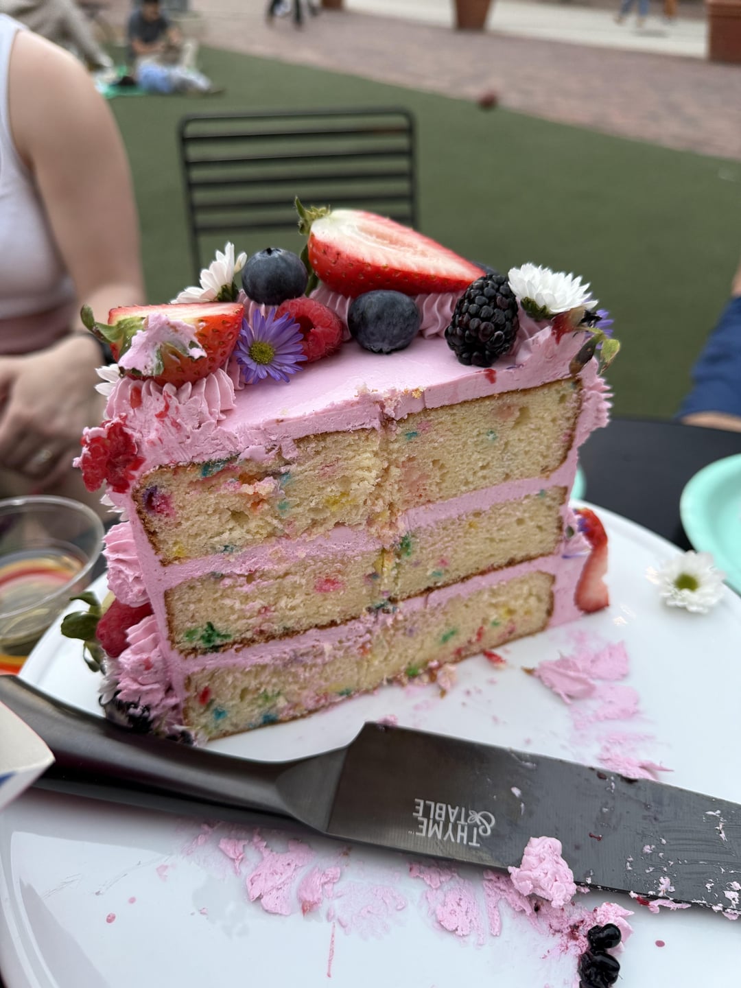 Pink cake, full of fruit flavors and lots of fruit decorations
