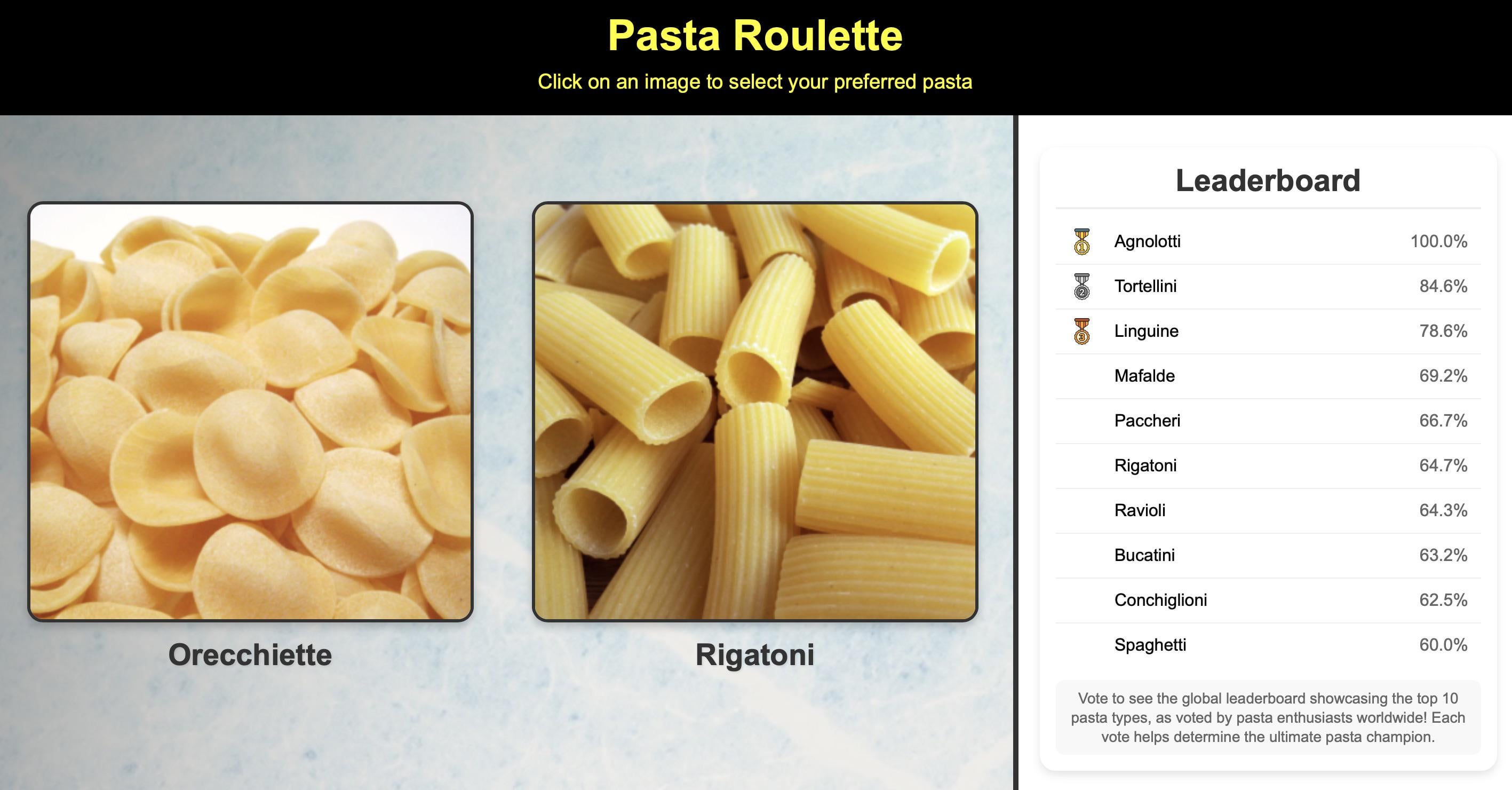 I built a simple web app where you can vote on pasta shapes by picking between two options at a time. The rankings update live based on win rate (successes vs total matchups).