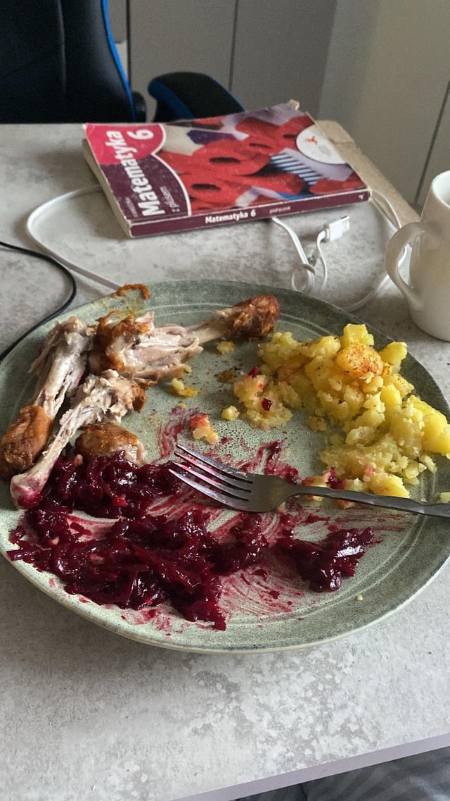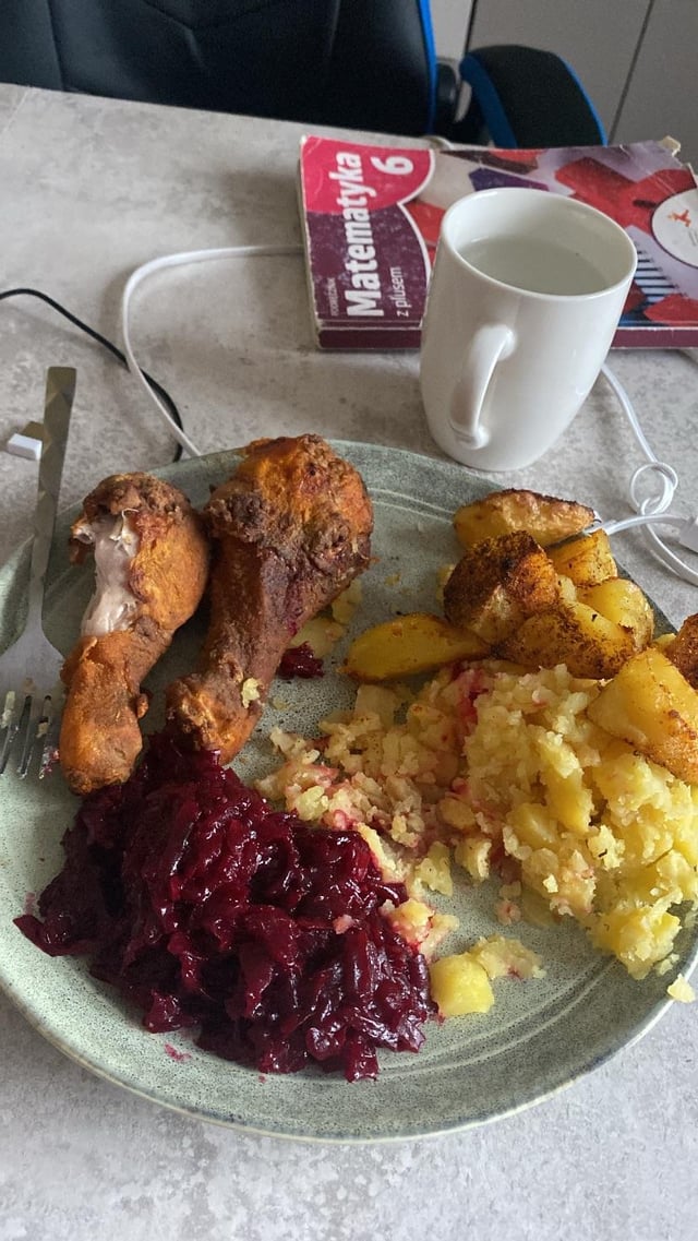 (+1 chicken drumstick! like in the 2nd slide) i got some beetroot on the side, some mash potatoes just boiled in water nothing else added, and some roasted potatoes with a little seasoning from the airfryer. chicken had no egg wash, it just had a little bit of oil to help the seasoning i put on it stick, and then coated thinly in flour, and air fried. i didnt eat all of it, but for how much i did, how many kcal roughly? thank you!
