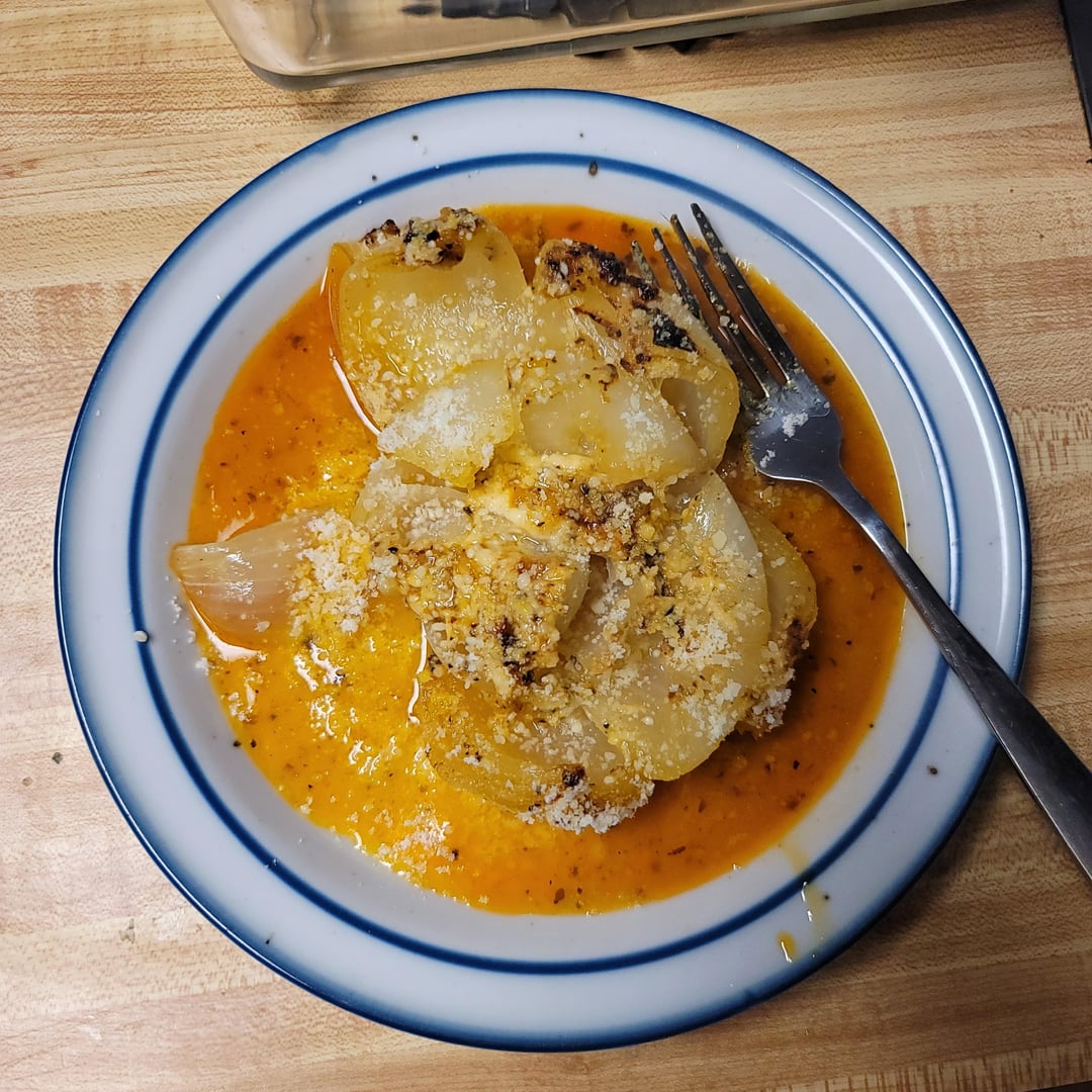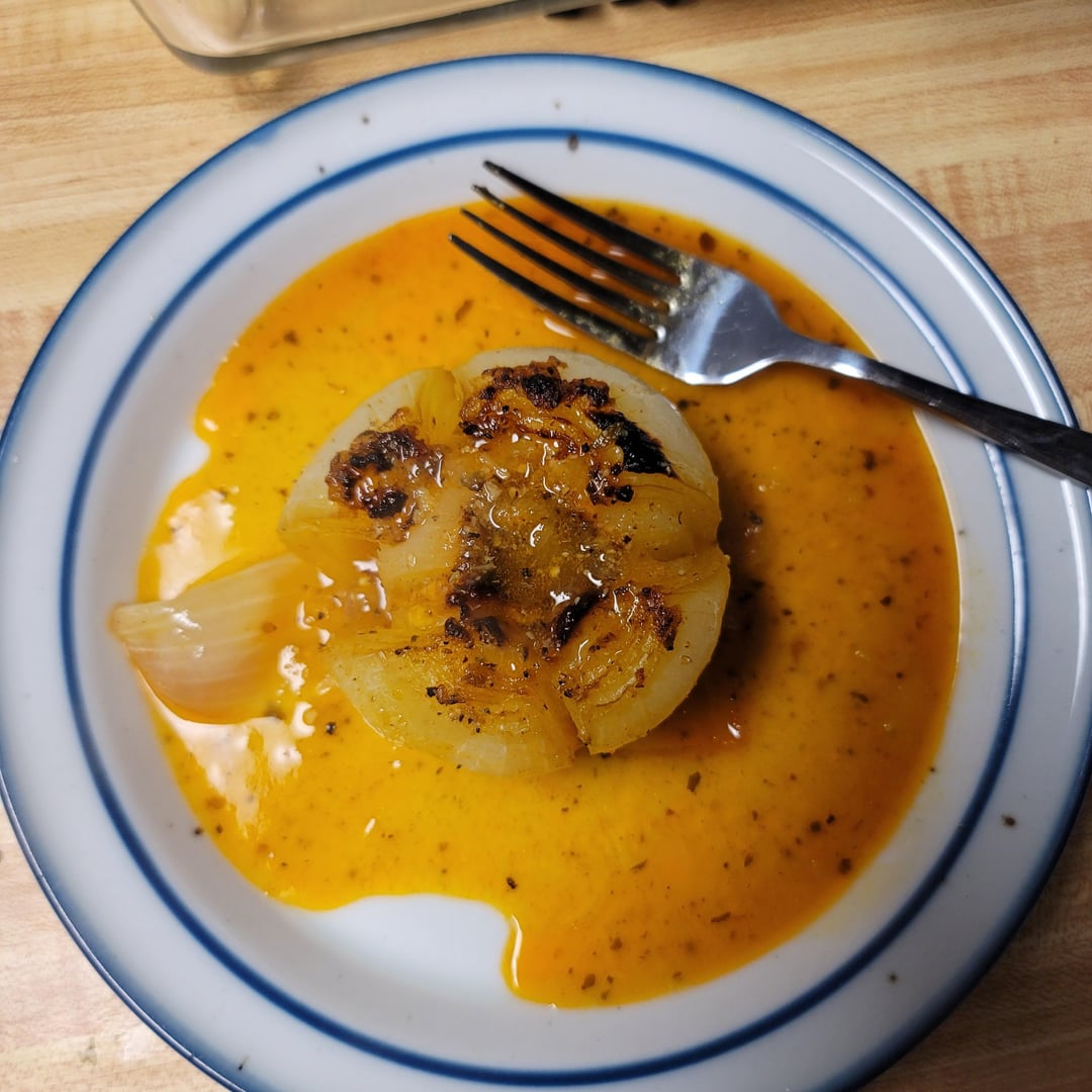 It’s literally just a tinfoil wrapped baked onion. Score it but keep it intact. Stuff with butter and seasoning and a little bit of oil. Bake at like 375F for an hour