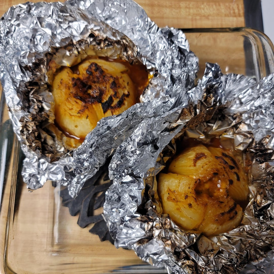 Onion quartered not all the way through. Fat (oil or butter) seasoning to flavor (salt, pepper, adobo powder, tajin chili lime) whatever you want. Wrap in foil throw on girl or in camp fire until desired texture and enjoy. My Mom calls them “Hippie bulbs”.
