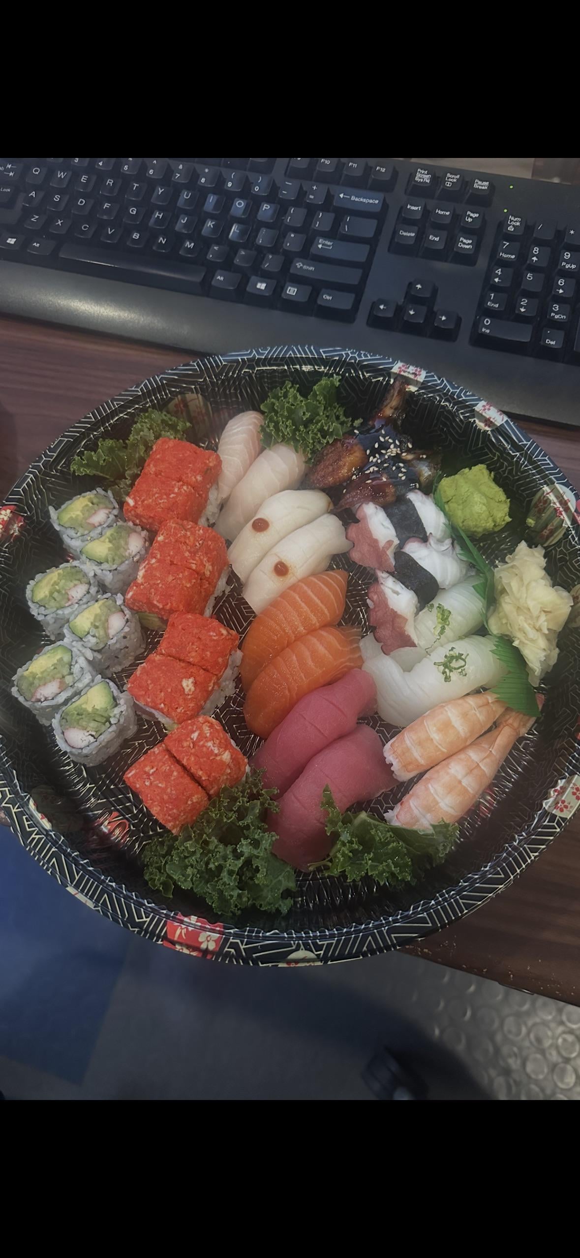 This is a lot of filler. 2 rolls with barely any real fish I’m guessing, “white fish”, sad looking tuna, shrimp which are tasty but cheap, octopus which is prob rarely ordered. Oh and curly kale. They prob charge a premium but this isn’t worth much.