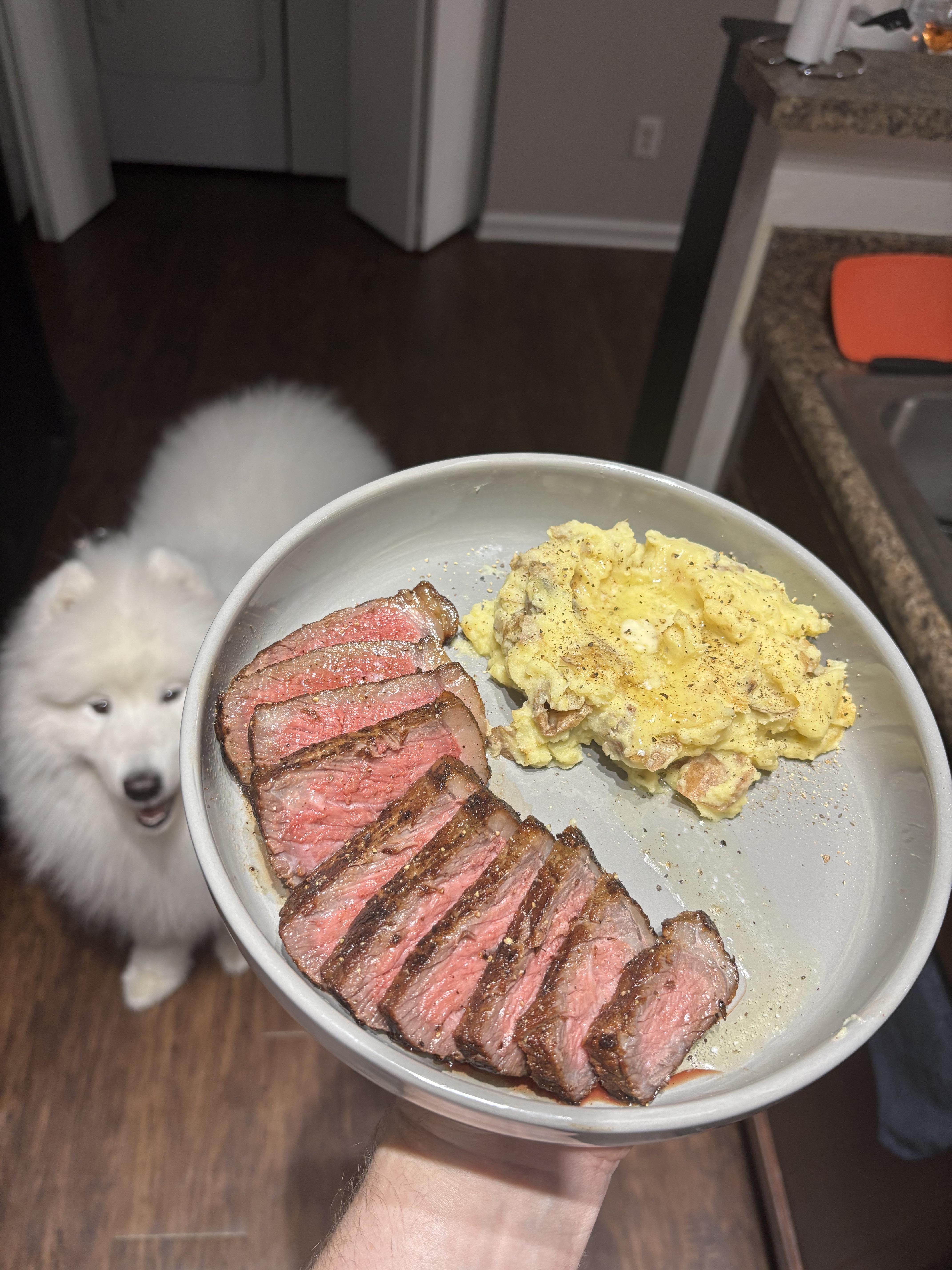 My dog says there’s too much gray bandby itskillwillson 10 Comments Dry-Implement2765 11 months ago I would tear that shit up Boring-Set-3234 11 months ago Steak and eggs = meal of champions! Beautiful_Ad_4942 11 months ago I would tear that up. And then eat the steak DirectionSolid9113 11 months ago Your dog would eat that with zero complaints. Distinct_Ant_8846 11 months ago What is in the eggs? Rhuarc33 11 months ago He’s right, but I’d still enjoy it. Not as much as a proper med rare but still well within good steak zone vegt121 11 months ago Your dog also said leave it to him/her to save your trouble ronin__9 11 months ago That got me hungry. I’d go hotter and faster. more pink, more char. Maybe lid it to steam that fat cap if pan fried. horseradish13332238 11 months ago Agreed Some_Way5887 11 months ago Your dog lameWrite A CommentYou must be logged in to post a comment.