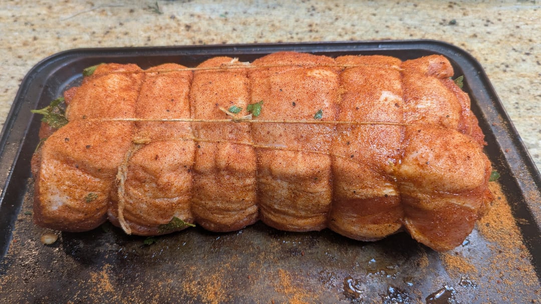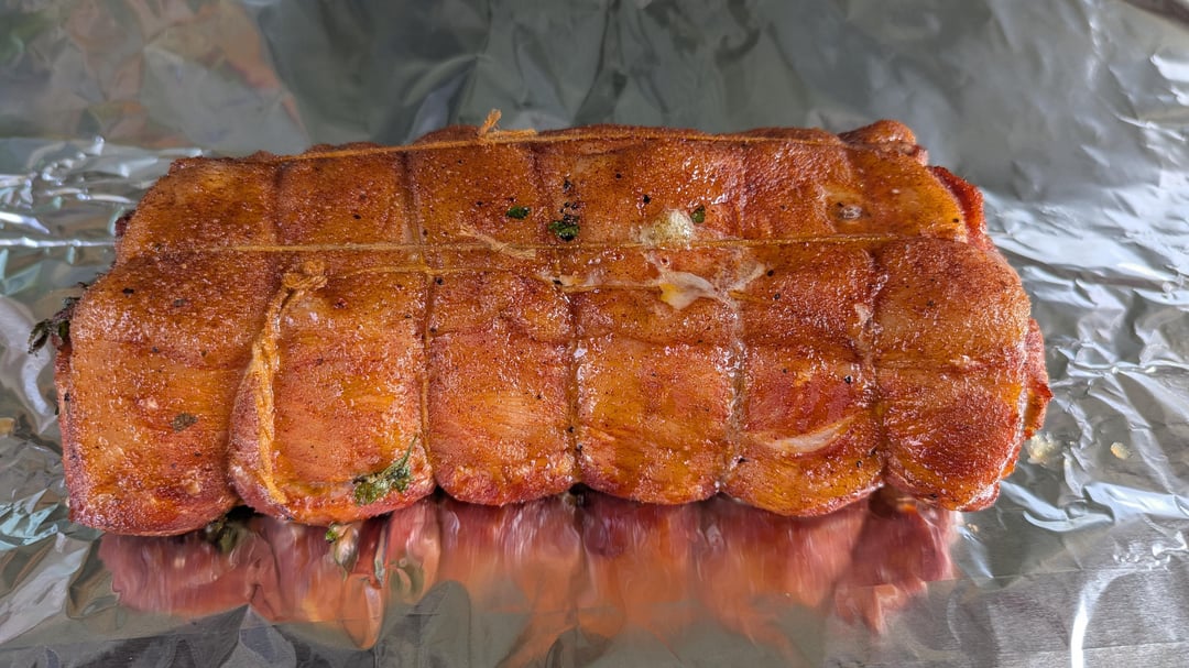 Stuffed with fresh Italian parsley, chopped garlic, and fresh rosemary. Trussed it up and covered with a generous coating of Meat Church Gospel rub. Cooked at 225°F for about 2 1/2 hours until internal temp reached 145. Wrapped in foil and a jumbo Ziploc and let it rest in my cooler for an hour before cutting. So tasty!