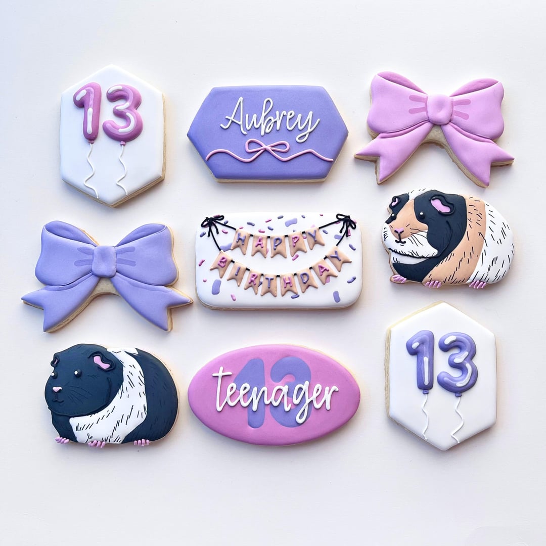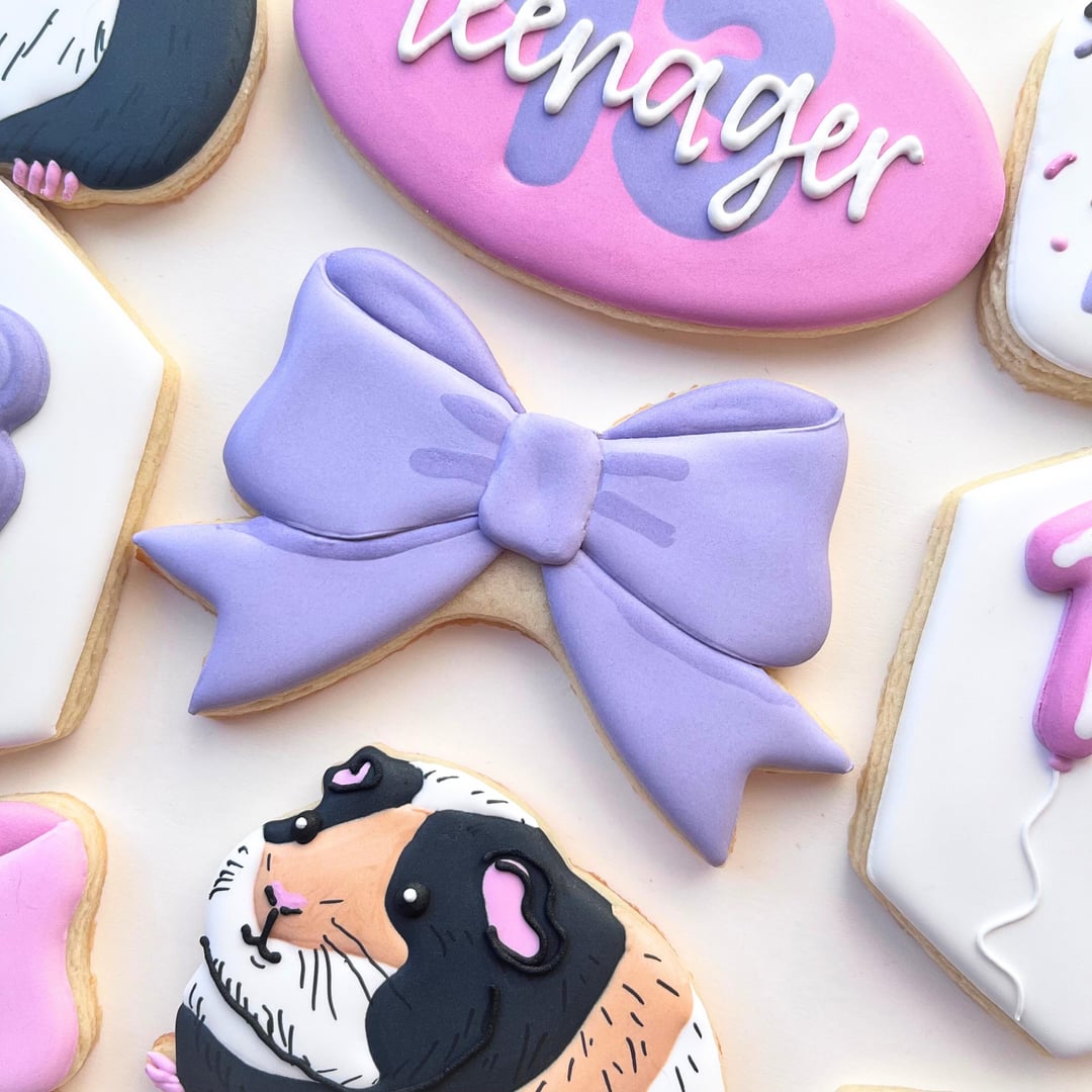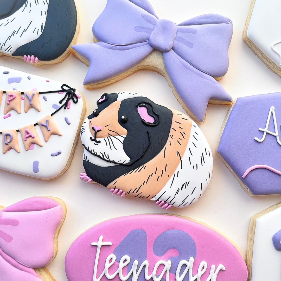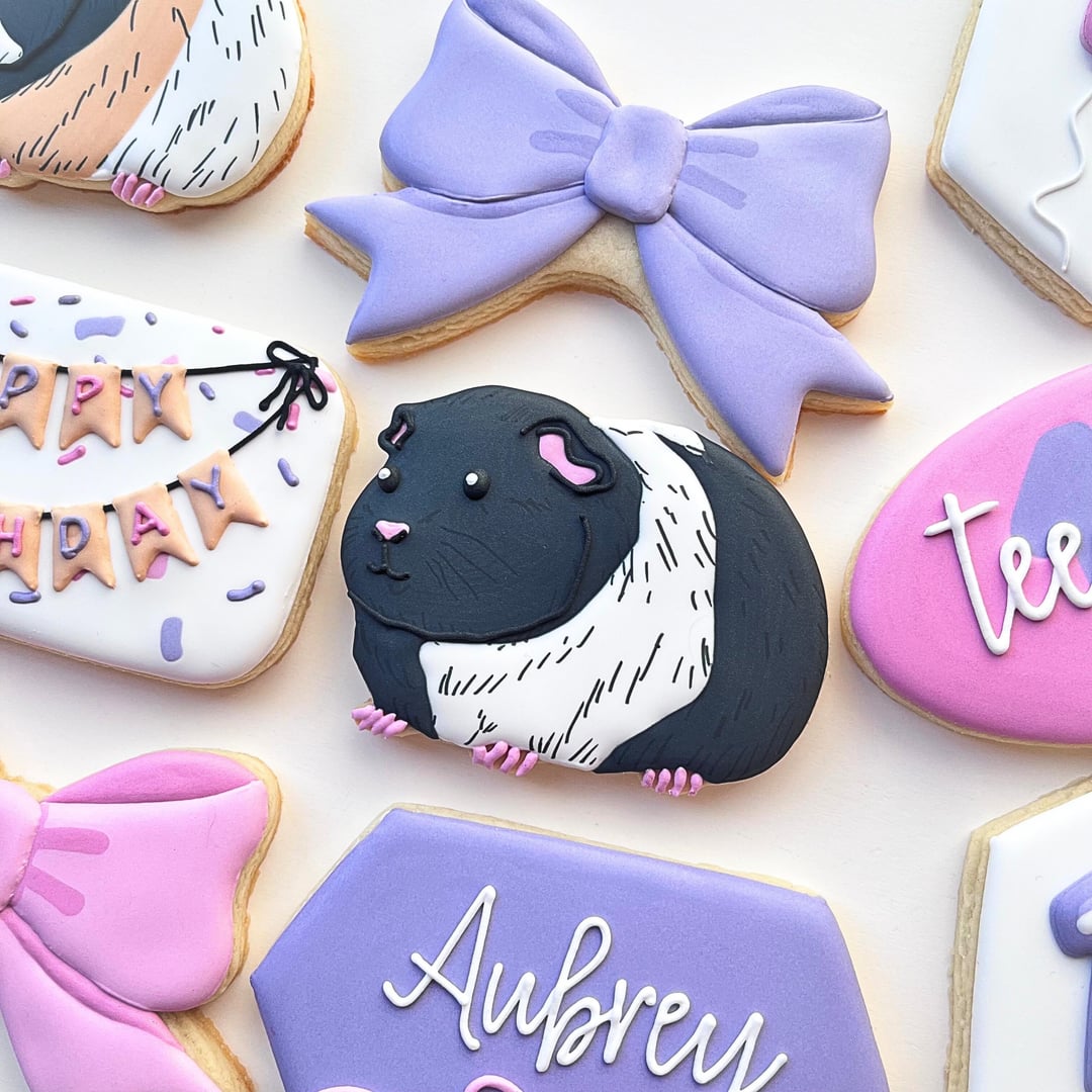 The birthday girl asked for pink & purple, bows, a “teenager” cookie, and…guinea pigs! Her mom sent me pictures of their two guinea pigs and I made them into cookies. Tooooo cute!