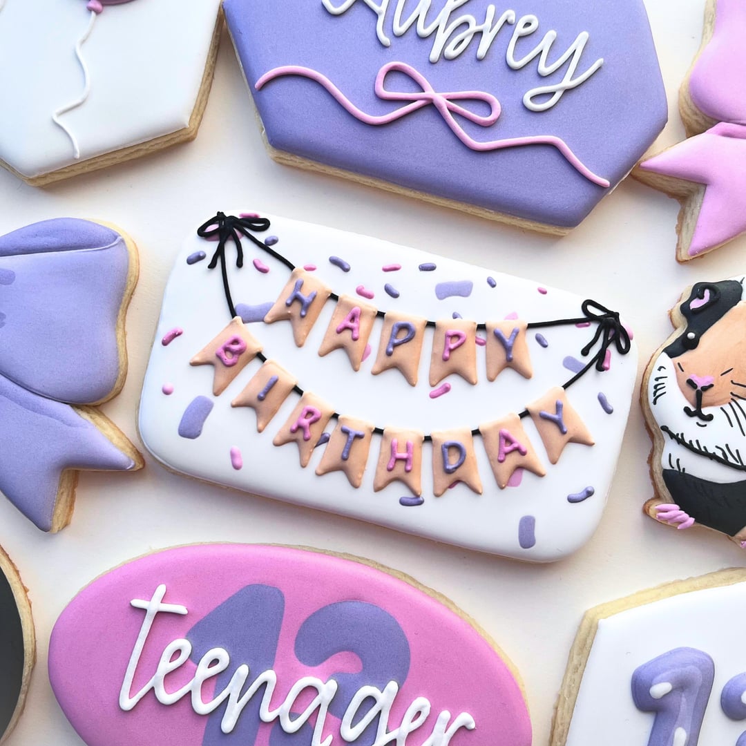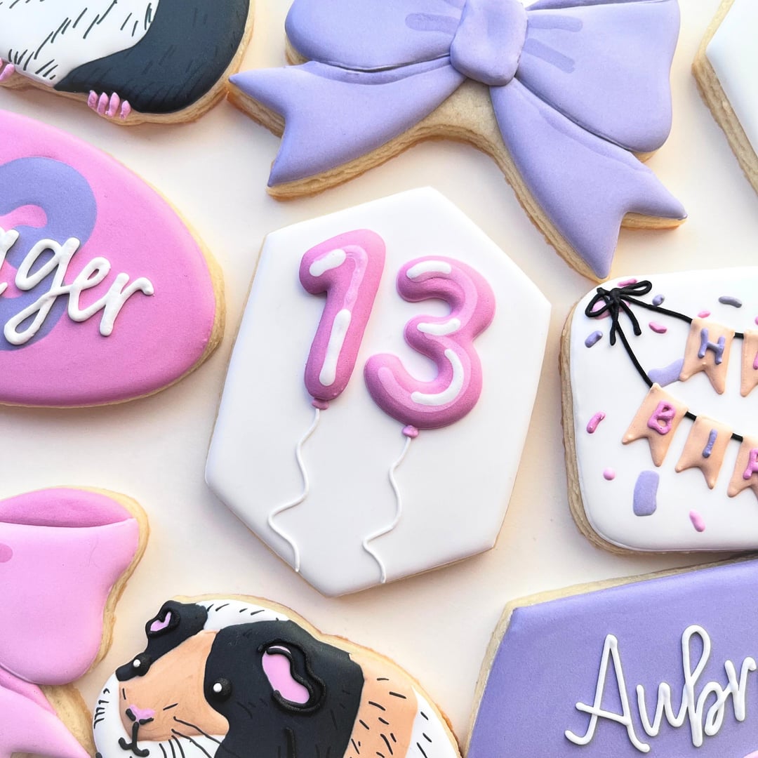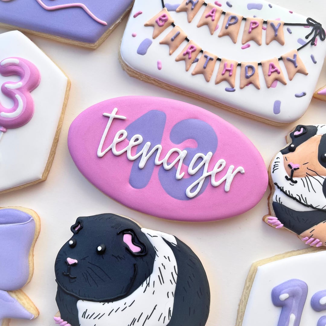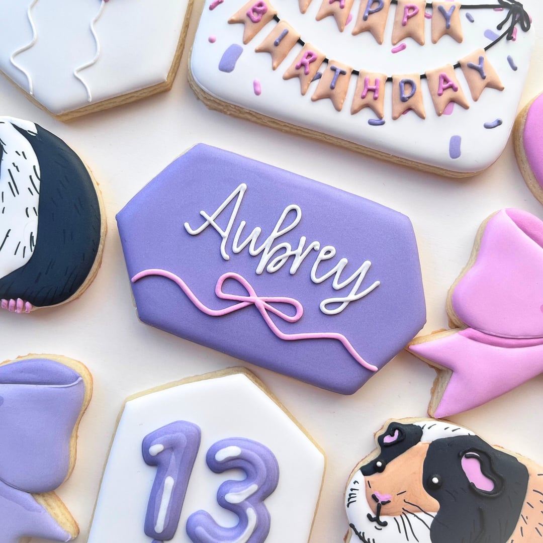 The birthday girl asked for pink & purple, bows, a “teenager” cookie, and…guinea pigs! Her mom sent me pictures of their two guinea pigs and I made them into cookies. Tooooo cute!