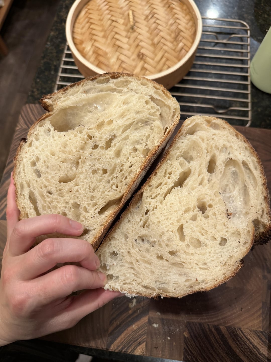 i’m beyond excited that i finally might be turning a corner in my bread journey! next time im going to see if i can recreate this success while making 2 loaves at once. i also want to brown it a bit more for a bit more color.