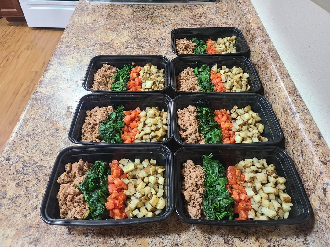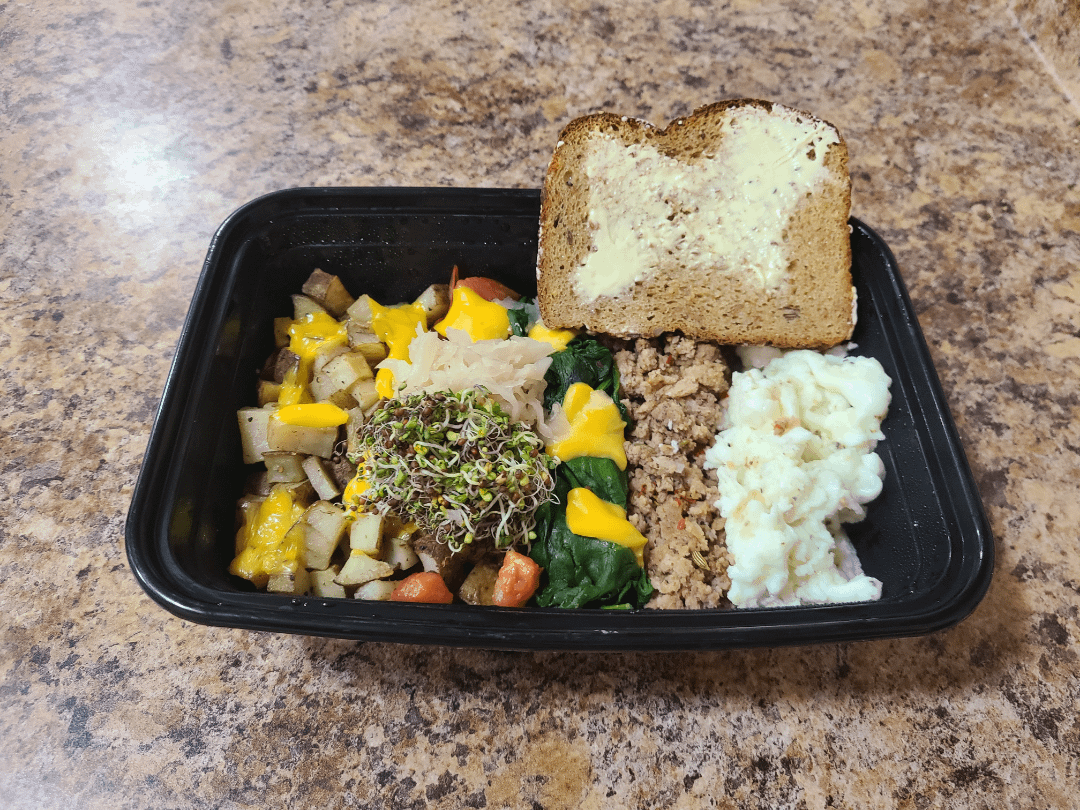 Breakfasts: 93/7 ground turkey, steamed baby spinach, sautéed tomato, oven roasted diced potatoes. Each morning I scramble egg whites and make a small piece of buttered multigrain toast. Topped with American cheese, homegrown broccoli sprouts and sauerkraut.