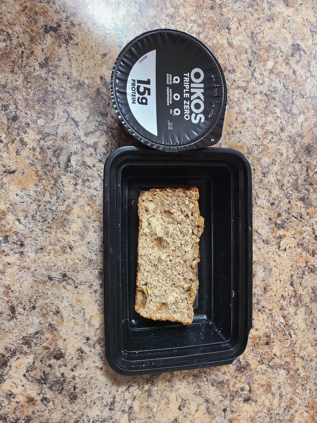 Afternoon: protein banana bread with walnuts, side yogurt cup. Recipe: https://youtu.be/9Btsb58ZDPE?si=5LGI5t_yspclo2fB
