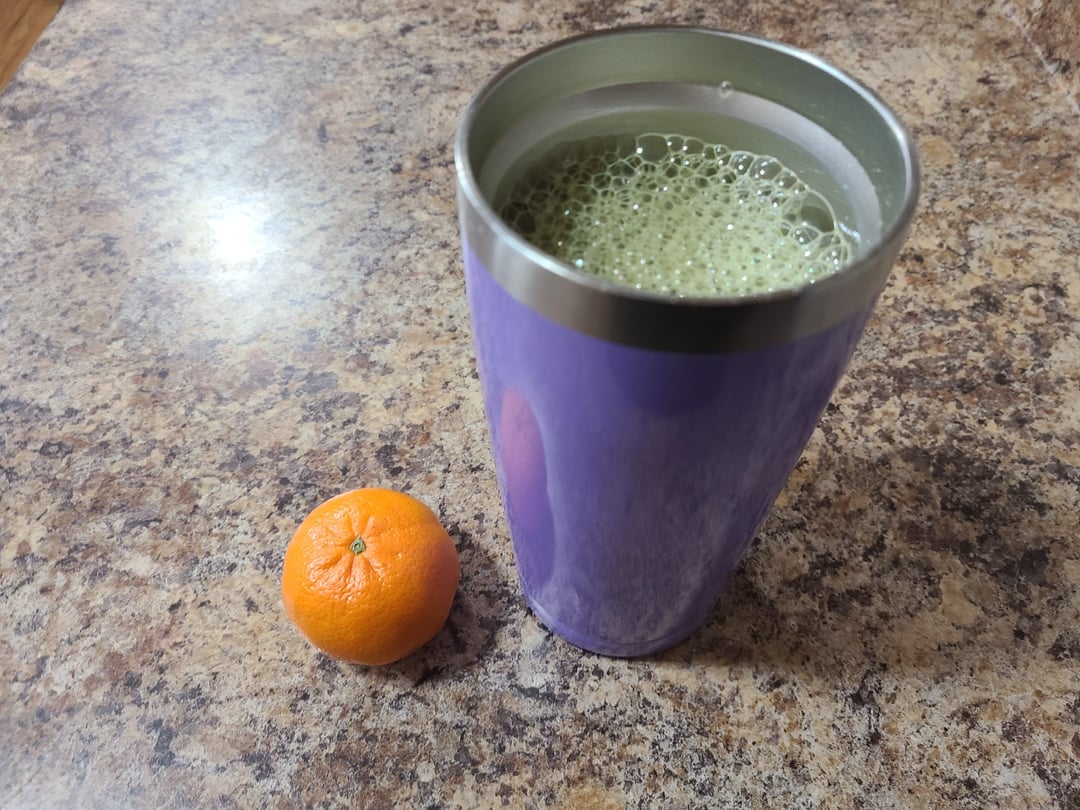 Midmorning: matcha latte with almond milk, collagen and fiber powder, tangerine.