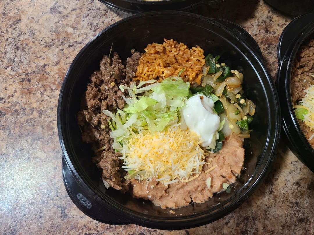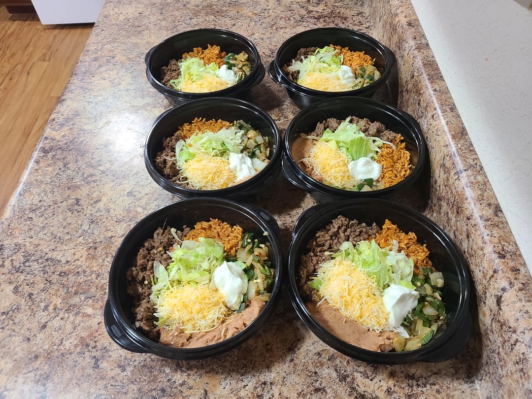 Dinners: 93/7 ground beef seasoned with salsa verde, spicy green pepper flakes blend and taco seasoning. Spanish style brown rice, sautéed poblano peppers with white onion and garlic, canned refried beans. Topped with iceberg lettuce, low-fat Mexican blend cheeses and Greek yogurt.