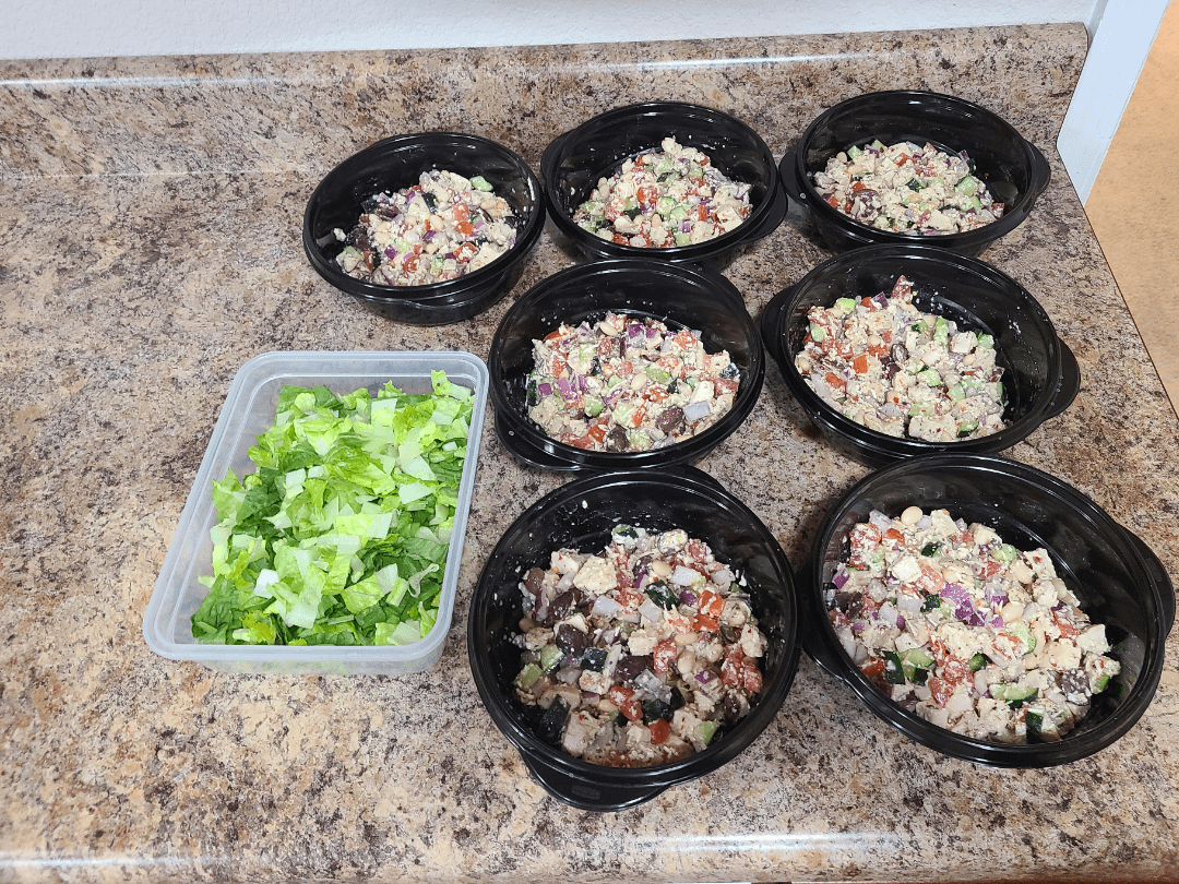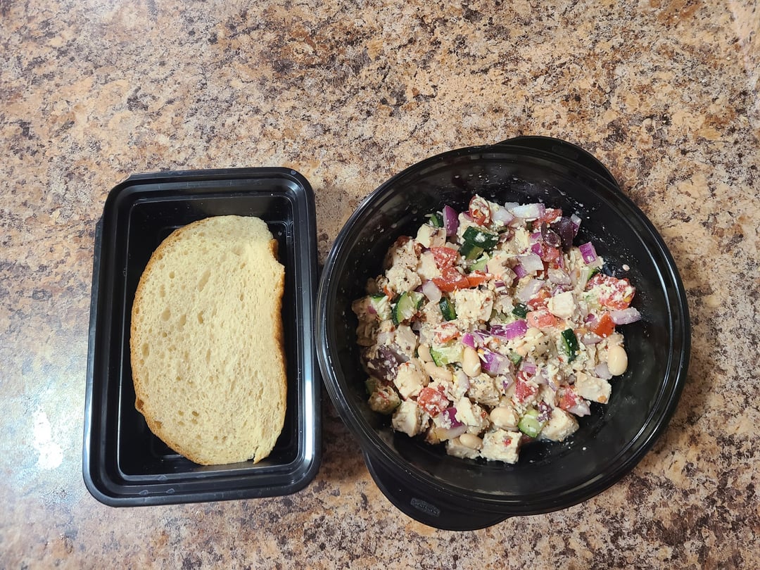 Lunches: Greek inspired salads with diced cucumber, tomato, red onion, baked chicken breasts, Great Northern beans, kalamata olives, shredded Parmesan cheese and grated 5 cheeses blend. Dressed with lemon juice, red wine vinegar, herbs, salt and pepper and Italian dressing. I top it daily with shredded Romaine lettuce, side sourdough bread.