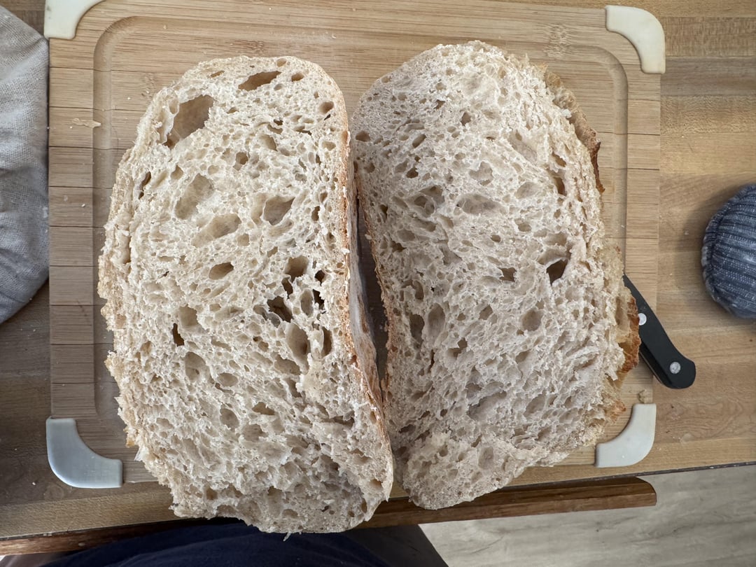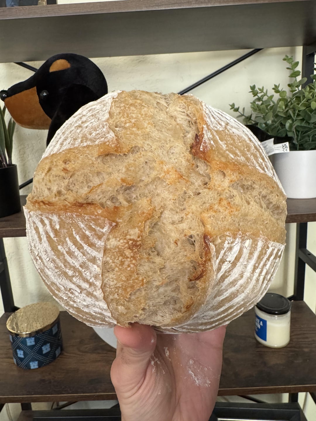 I waited 12 hours to slice that. I also think my 10” Dutch oven is maybe a little small + it’s got a round bottom so it makes the shape a little bunched up and wonky but eh, I don’t seem to mind.