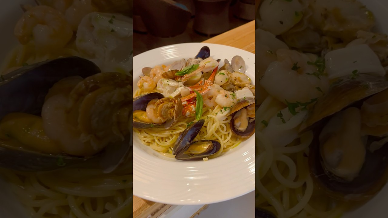 Pescatore Pasta- Bianco Perfectly cooked spaghetti tossed in a rich white wine sauce, loaded with seafood like Mussels, clams, shrimp, and squid. Simplicity meets elegance on your plate