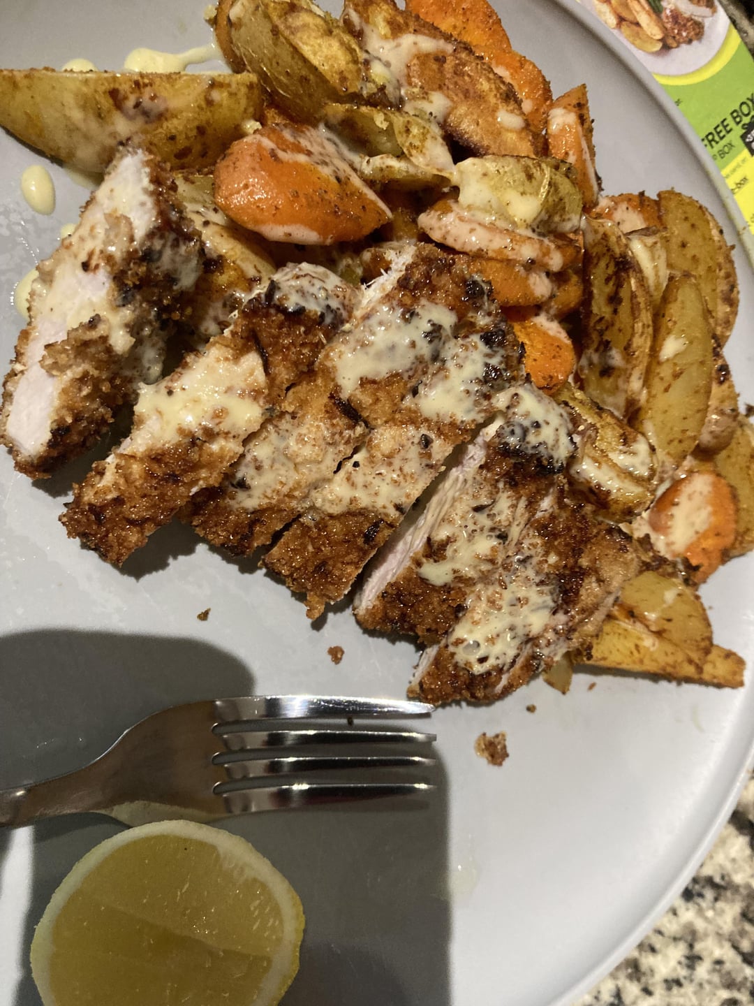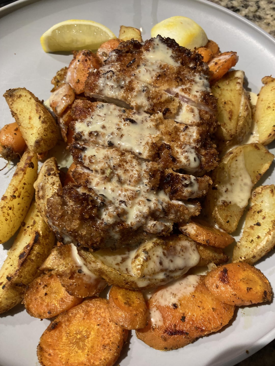 This looks fantastic. I’m about to dig in.I added curry powder and ginger to my carrots, cooked veg 24 minutes, cast iron on the pork schnitzel .I love this meal but don’t love the leftover oil.by Ok_Drawer7797 Write A CommentYou must be logged in to post a comment.