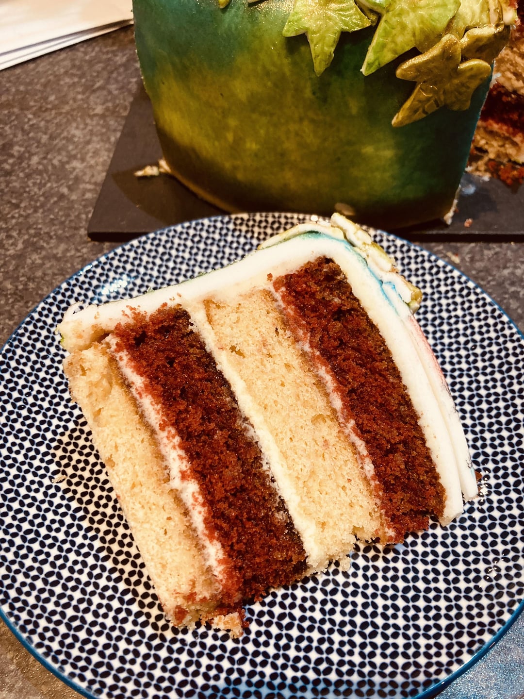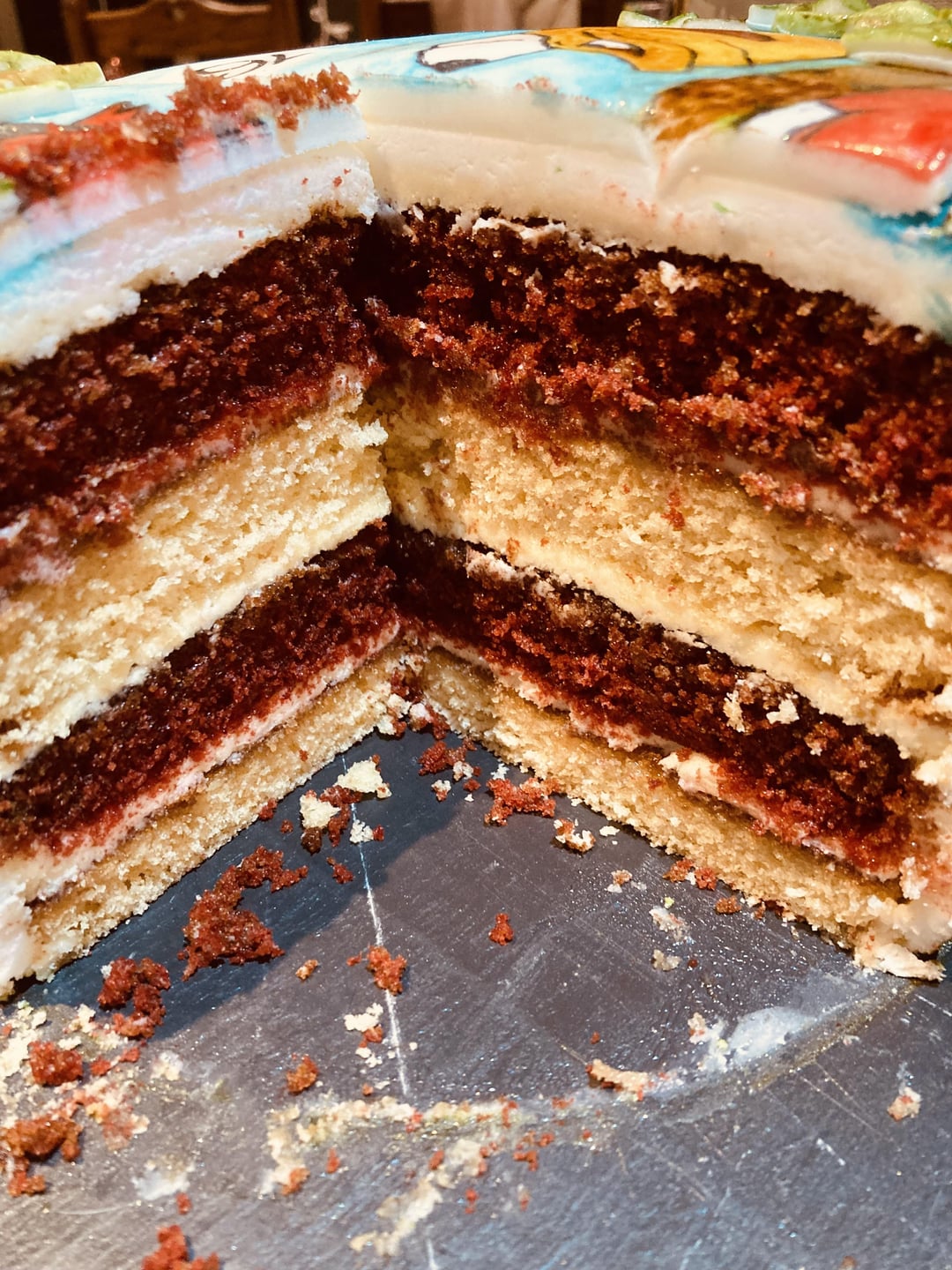 Fox and the Hound themed cake with red velvet AND vanilla sponge (because one flavour isn’t enough) and vanilla buttercream icing (thinly spread) and loads of jam.