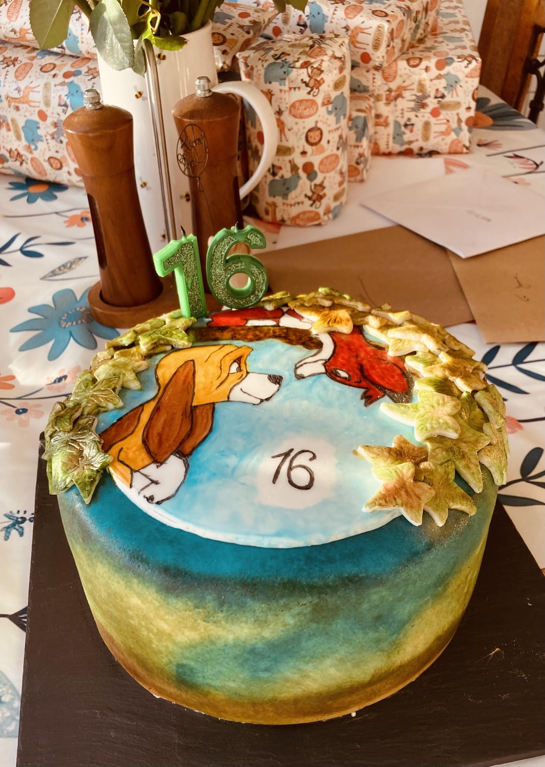 That is about the best tribute cake I’ve ever seen. Truly the leaves, frosting particularly the fox and hound work is excellent- clever creative, on point thematically. The interior absolute perfection- clear definition between layers, even application of frosting, the every other idea was superb. Well done.