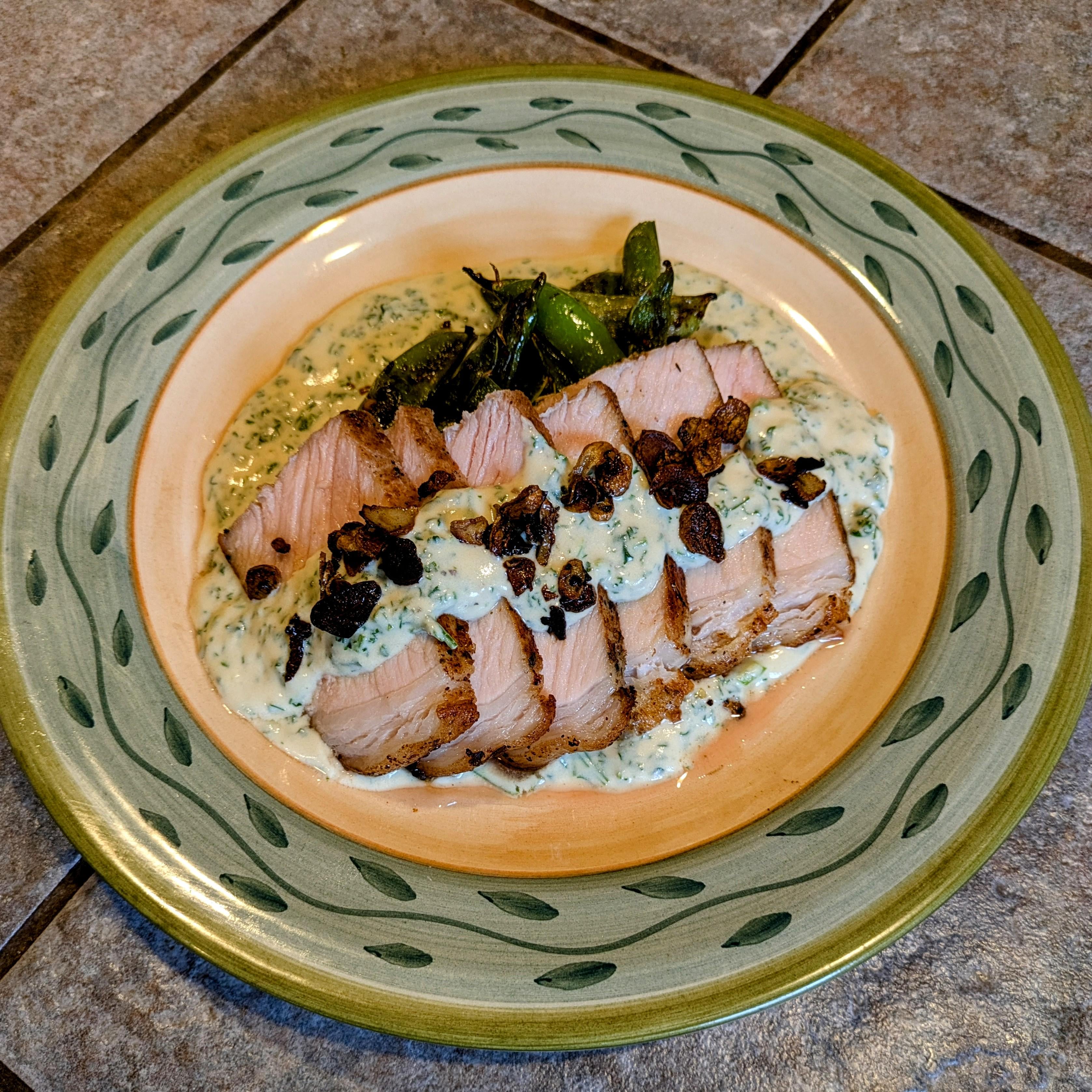This might be one of my favorite sous vide dishes I've made. Thick cut pork chops with some Costco garlic and herb seasoning cooked at140F for 2.5 hours before sear. Charred snap peas. Parsley & mustard cream sauce. Crispy garlic.